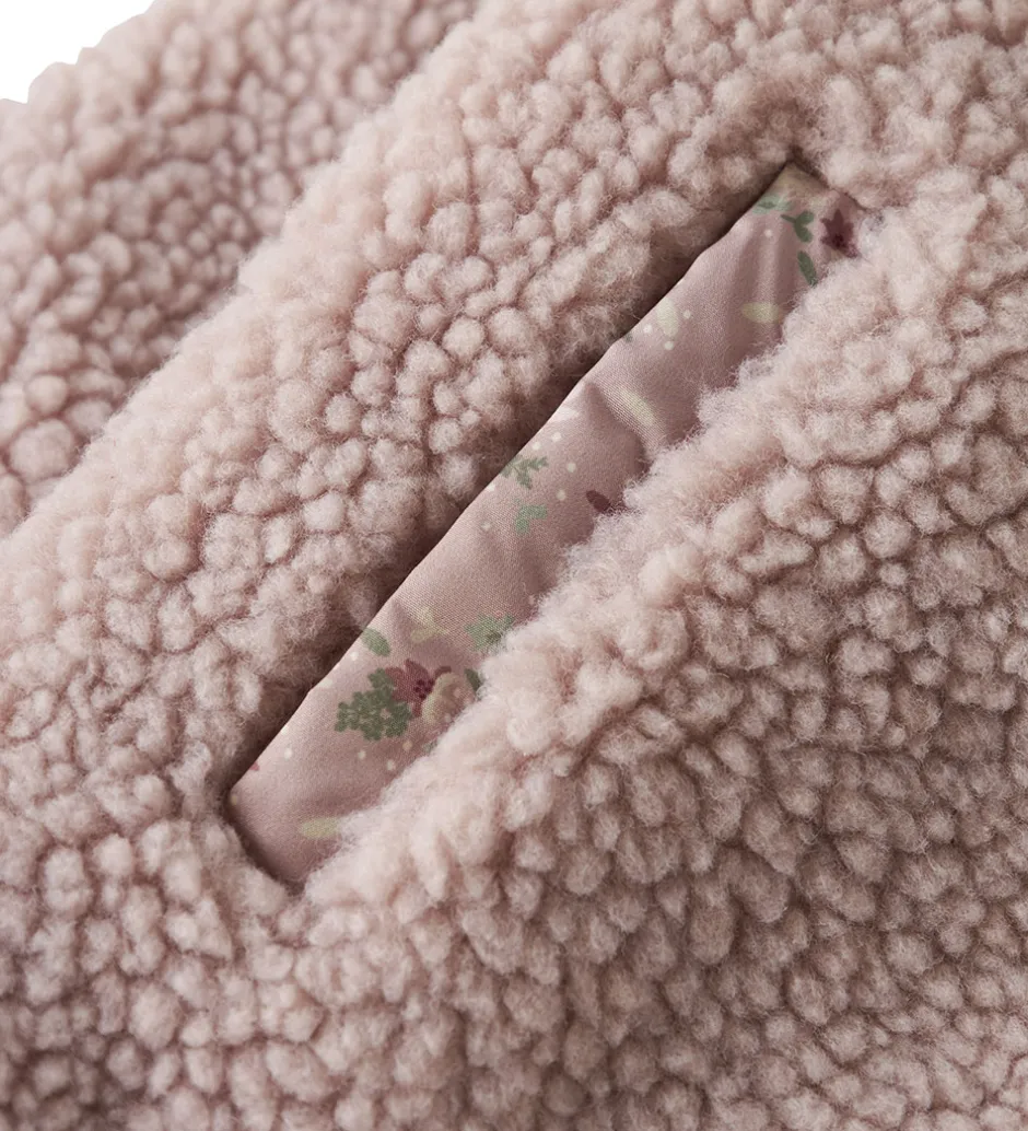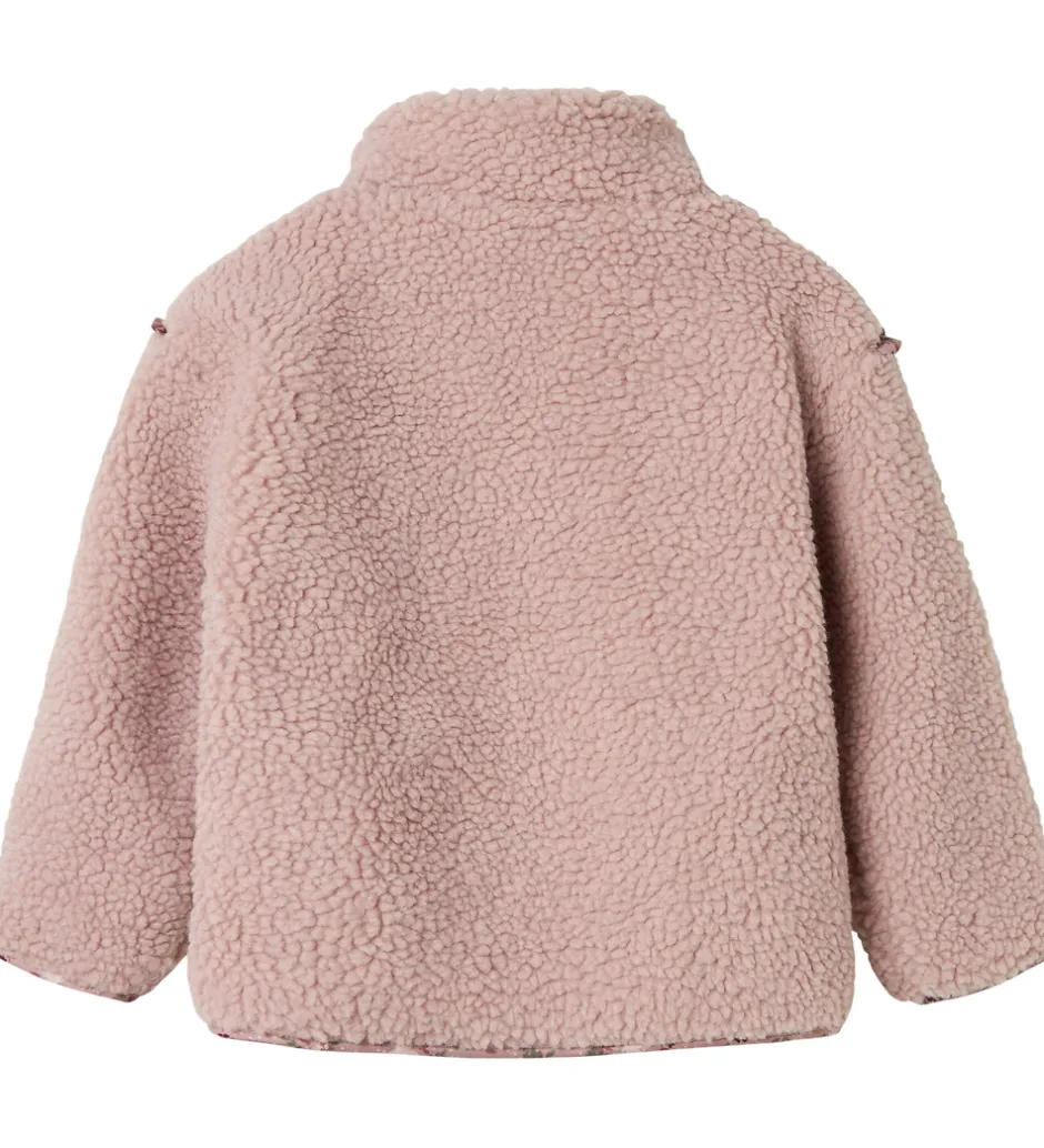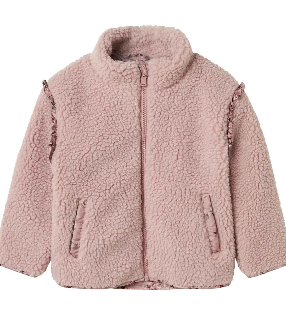 Blød Name It fleecejakke i rosa teddyfleece og med småblomstrede kanter og for, der giver et behageligt udtryk. Fleecejakken har lange ærmer og en høj hals. Den åbnes fortil med en lynlås, der har en beskyttelsesklap.