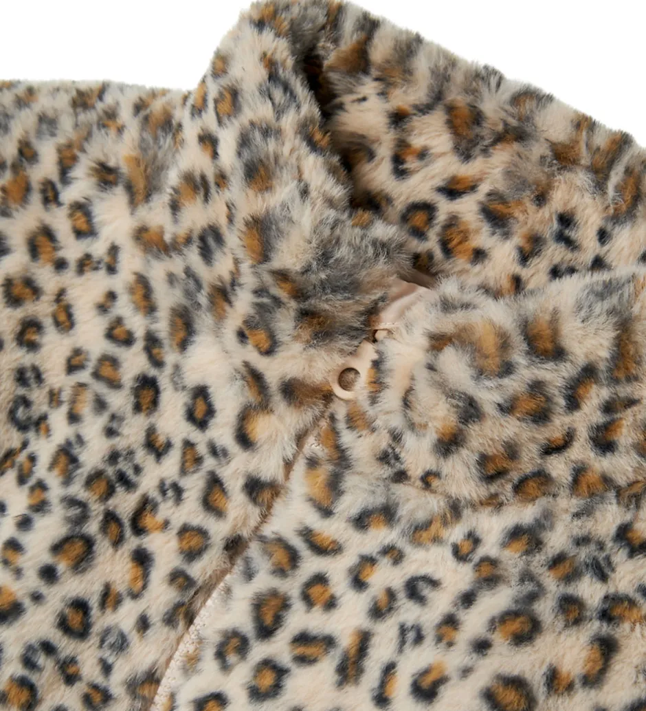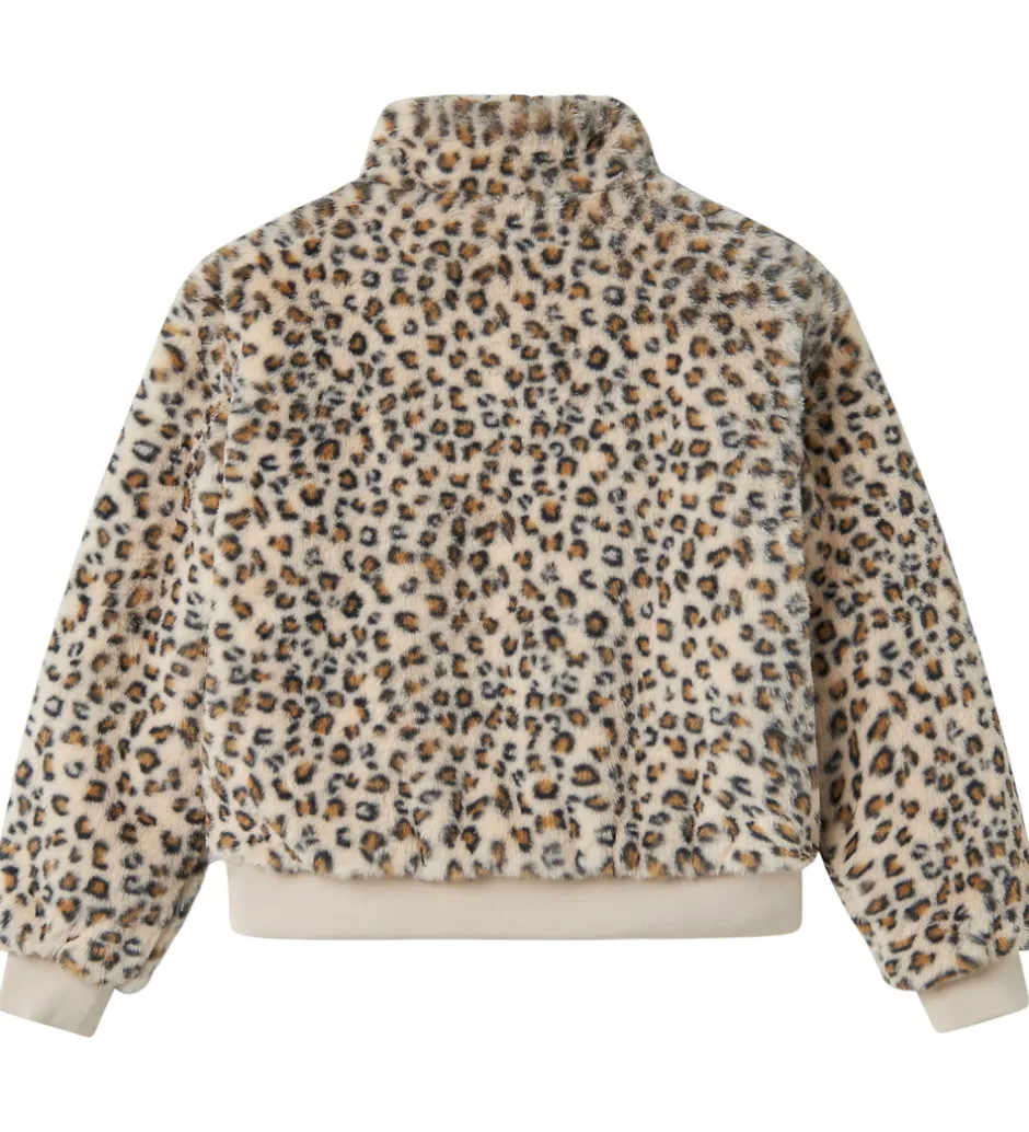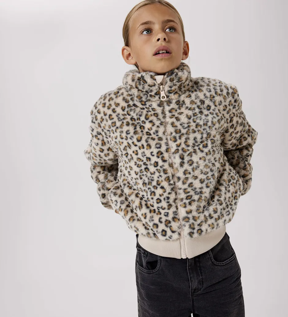 Fin Name It jakke af imiteret pels i et beige og brunt leopardmønster.