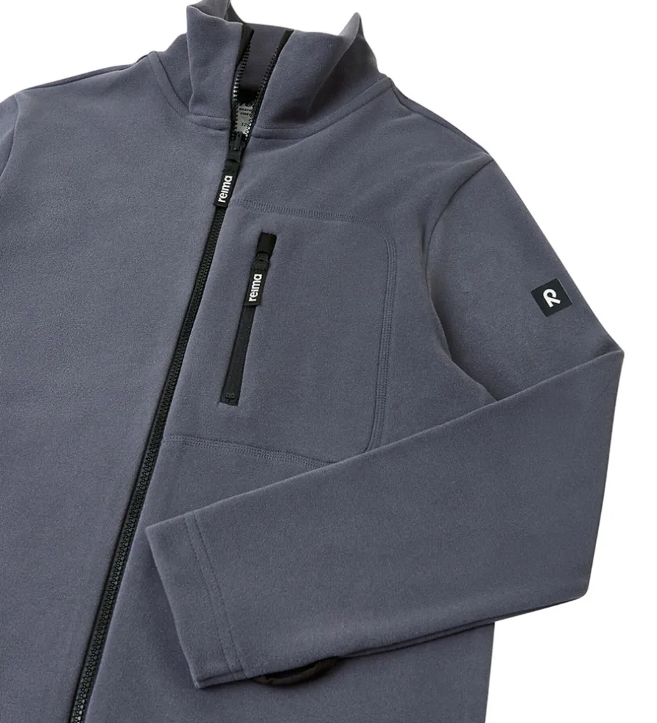 Reima fleecejakken har en høj hals, og den lukkes med en lynlås med hagebeskytter. I venstre side har den en brystlomme, som lukkes med en lodret lynlås.