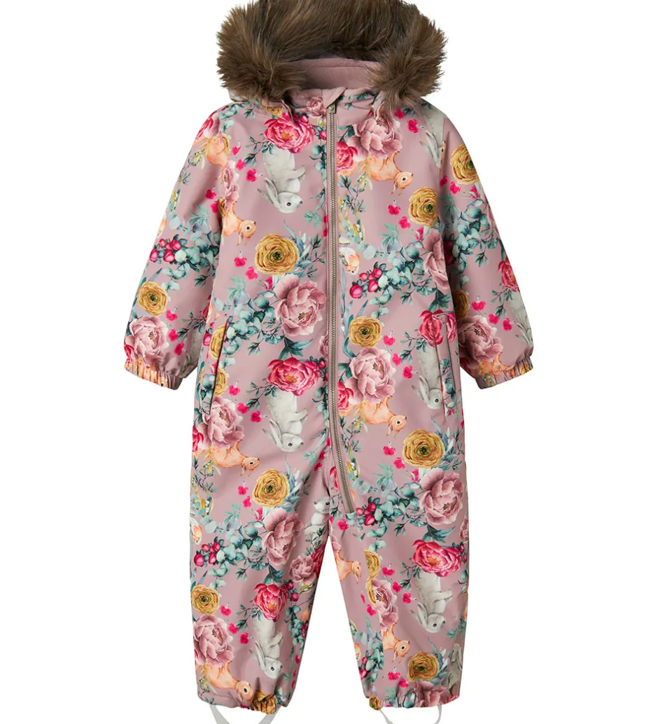 Flot Name It flyverdragt i rosa med et alloverblomsterprint med mange farver og kaniner.