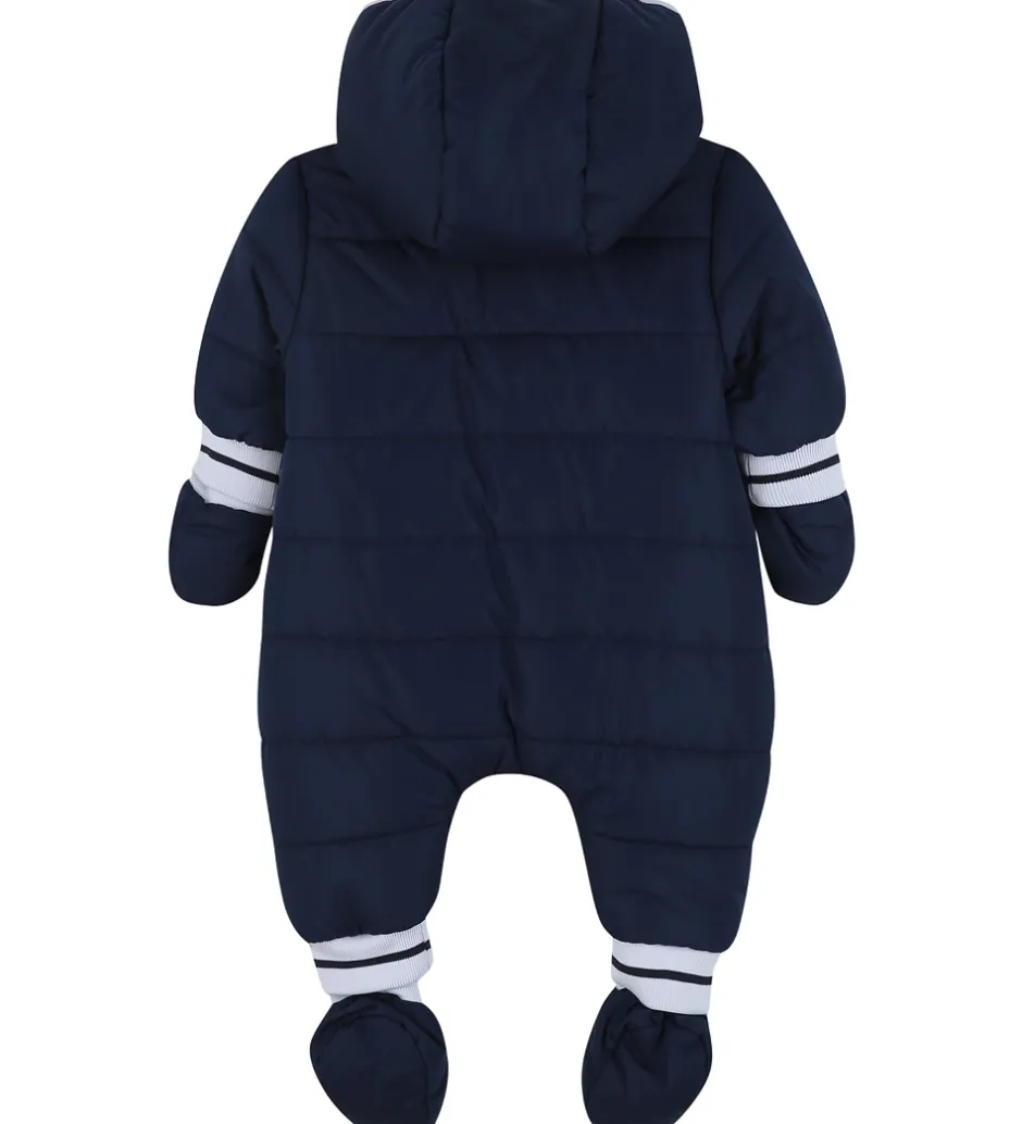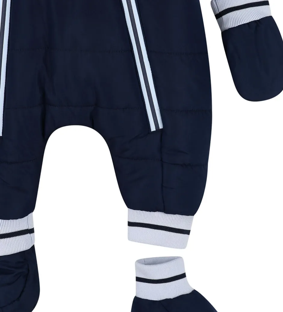 Smart BOSS flyverdragt i mørkeblå med lyseblå kanter med en smal, navy stribe, og fortil sidder der et mærke af navy frotté som former to B’er.