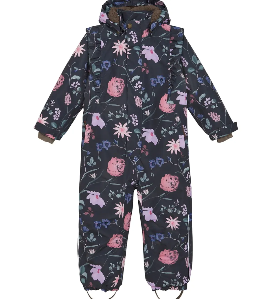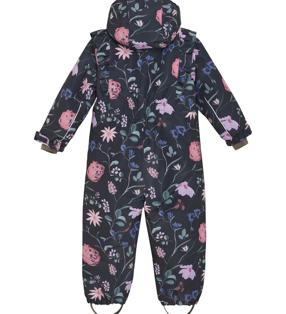 Pæn En Fant flyverdragt i mat sort med et alloverblomsterprint i rosa, lilla, blå og grønne farver. Flyverdragten er med refleksprint og -pipings og har flotte flæser over skuldrene.
