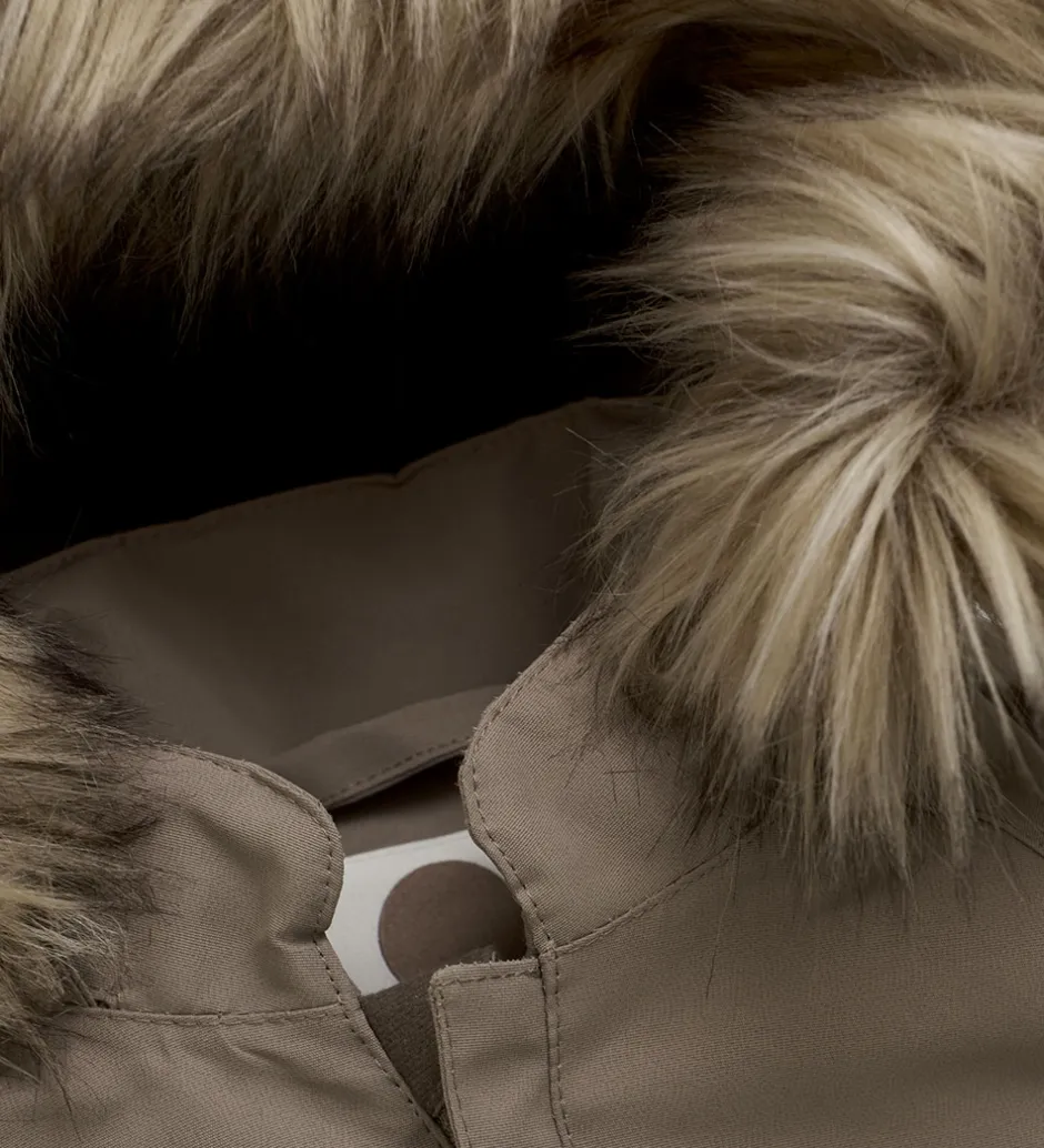 En Fant flyverdragten åbnes fortil ved hjælp af en skrå lynlås med en fleeceforet hagebeskytter og indvendig vindstolpe. Flyverdragten er justeret med en elastikindsats i ryggen.