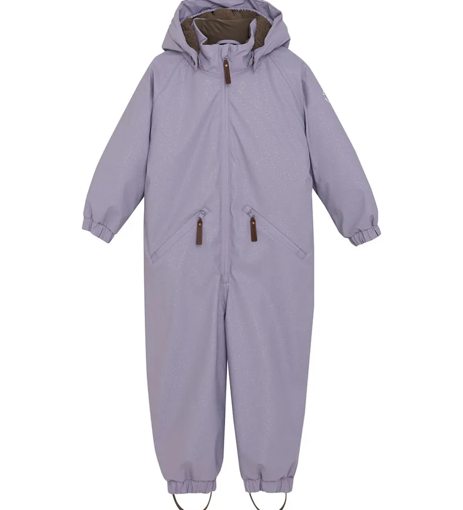 Sej En Fant flyverdragt i en dejlig, blød og vandtæt PU-kvalitet i støvet lilla med glimmer.