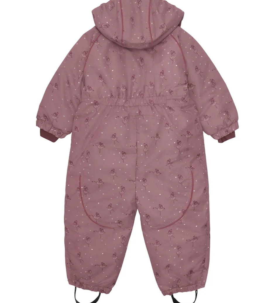 Pæn Hust and Claire flyverdragt i mørk lilla med alloverprint af hjerter og ballerinaer. Flyverdragten har fine rynkedetaljer fortil og også praktiske reflekspipings.