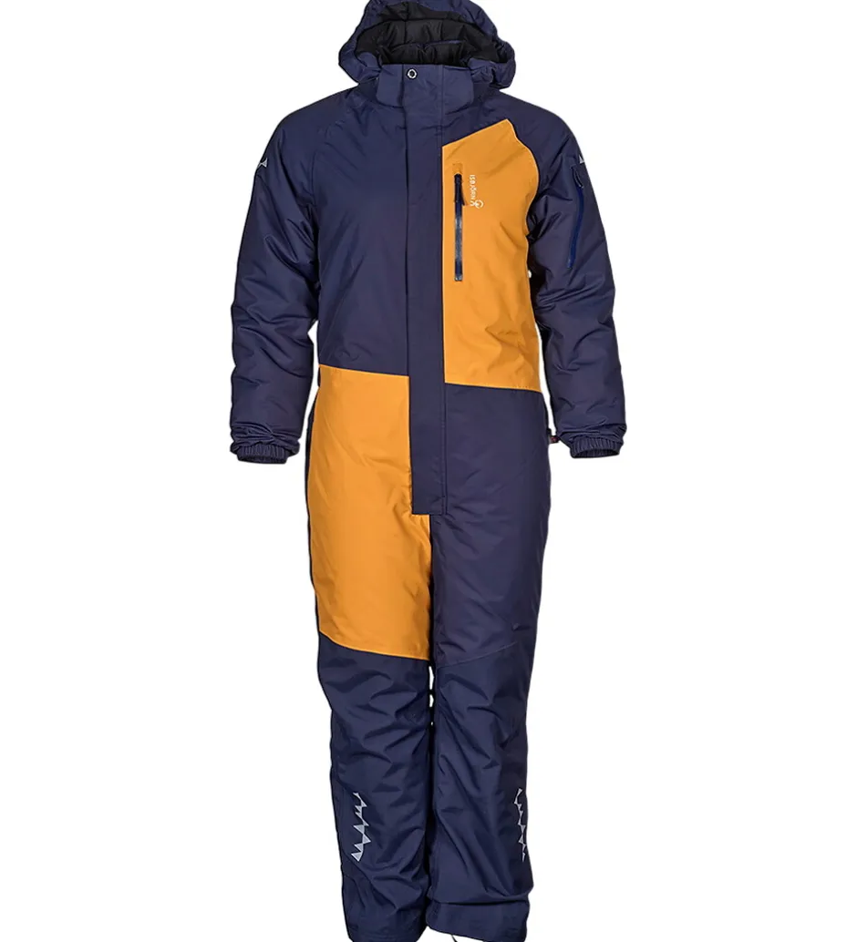 Fin Isbjörn Of Sweden flyverdragt navyblå med orange indsatser, der efterlader et ternet udtryk. Flyverdragten har hvide logoprint på venstre bryst og hætten samt smarte refleksprint på lænden, begge skuldre og ankler.