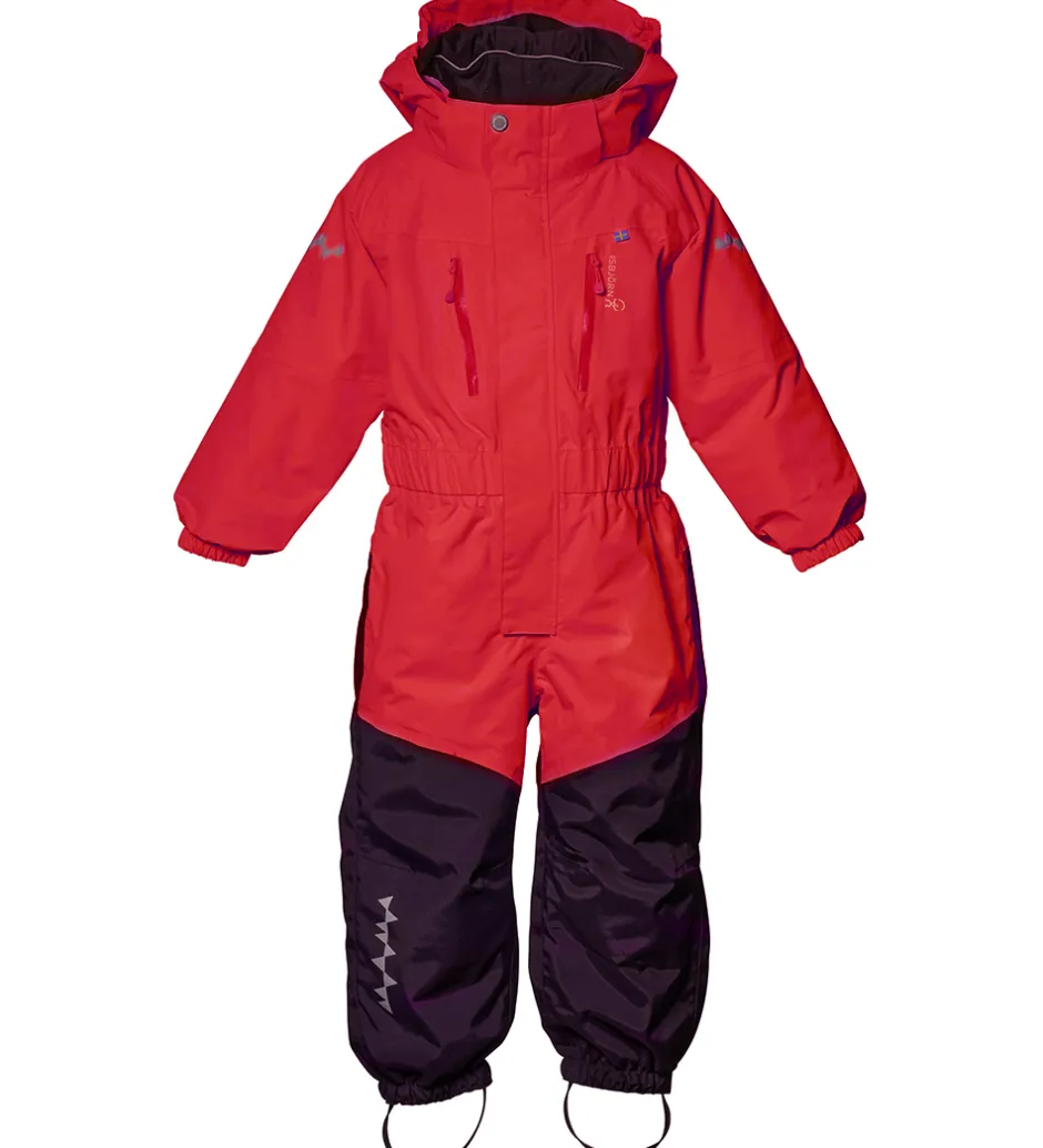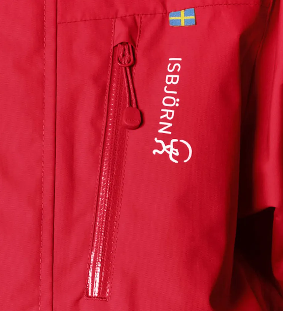 Flot Isbjörn Of Sweden flyverdragt i rød og sort. Flyverdragten har hvide logoprint på venstre bryst og hætten samt smarte refleksprint på lænden, begge skuldre og ankler.