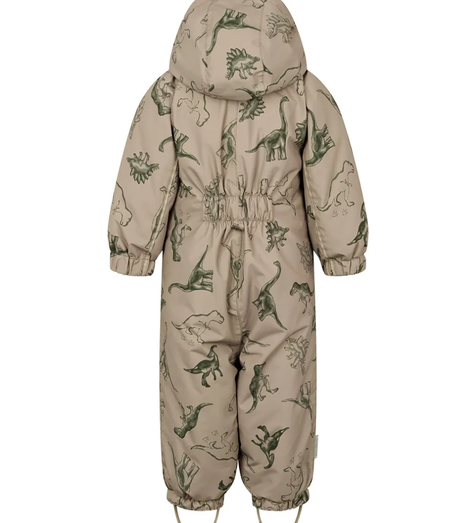 Smart MarMar flyverdragt i lysegrøn med et alloverprint af dinosaurer i grønne nuancer. Flyverdragten har praktiske refleksdetaljer.
