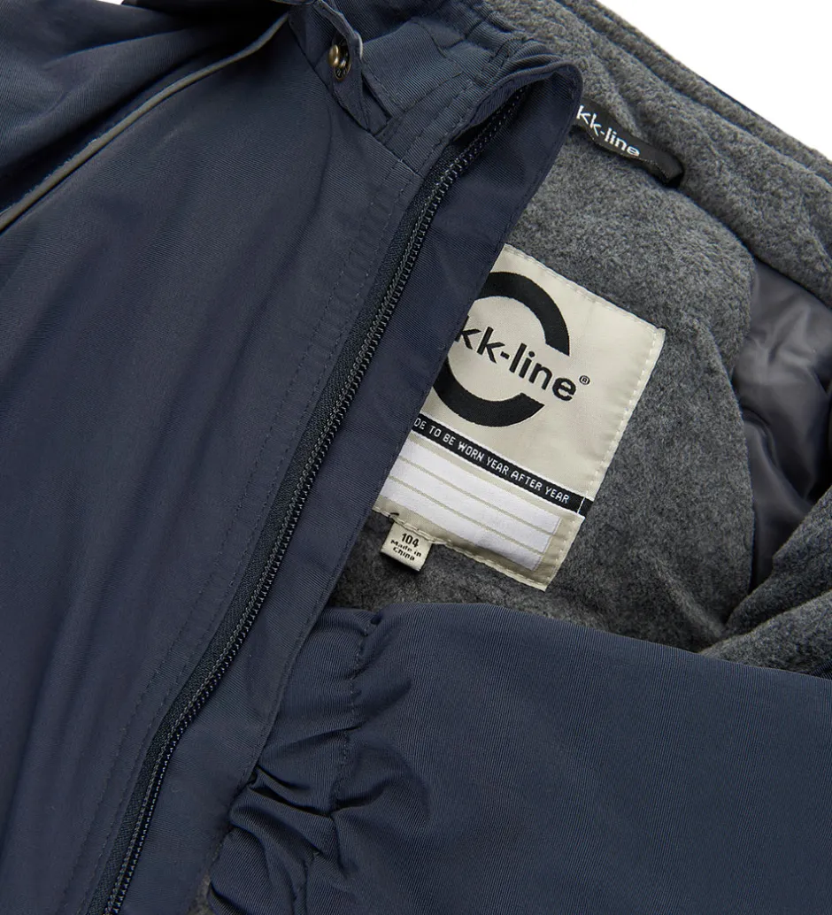 Mikk-Line flyverdragten har en elastik i taljen, som kan justeres indvendigt, hvis man ønsker et mere figursyet snit. Fortil er der en lynlåslomme i hver side. Flyverdragten åbnes med en lynlås med hagebeskytter og dobbelt vindstolpe. Indvendigt er der mørkegråt, blødt fleecefor i overkroppen, kraven, hætten og ved håndleddene, mens der er glatvævet for i resten af flyverdragten. Flyverdragten har en varm polyestervattering.