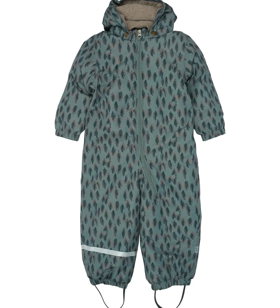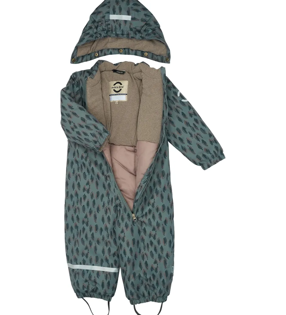 Flot Mikk-Line flyverdragt i en mørk, støvet grøn farve og med et bladlignende allovermønster. Flyverdragten har refleksdetaljer på hætten, venstre ærme og højre ben.