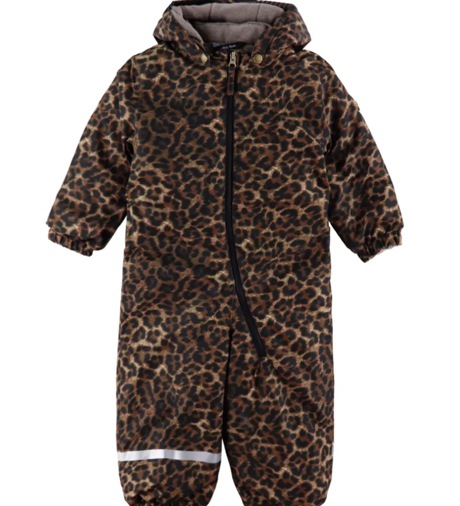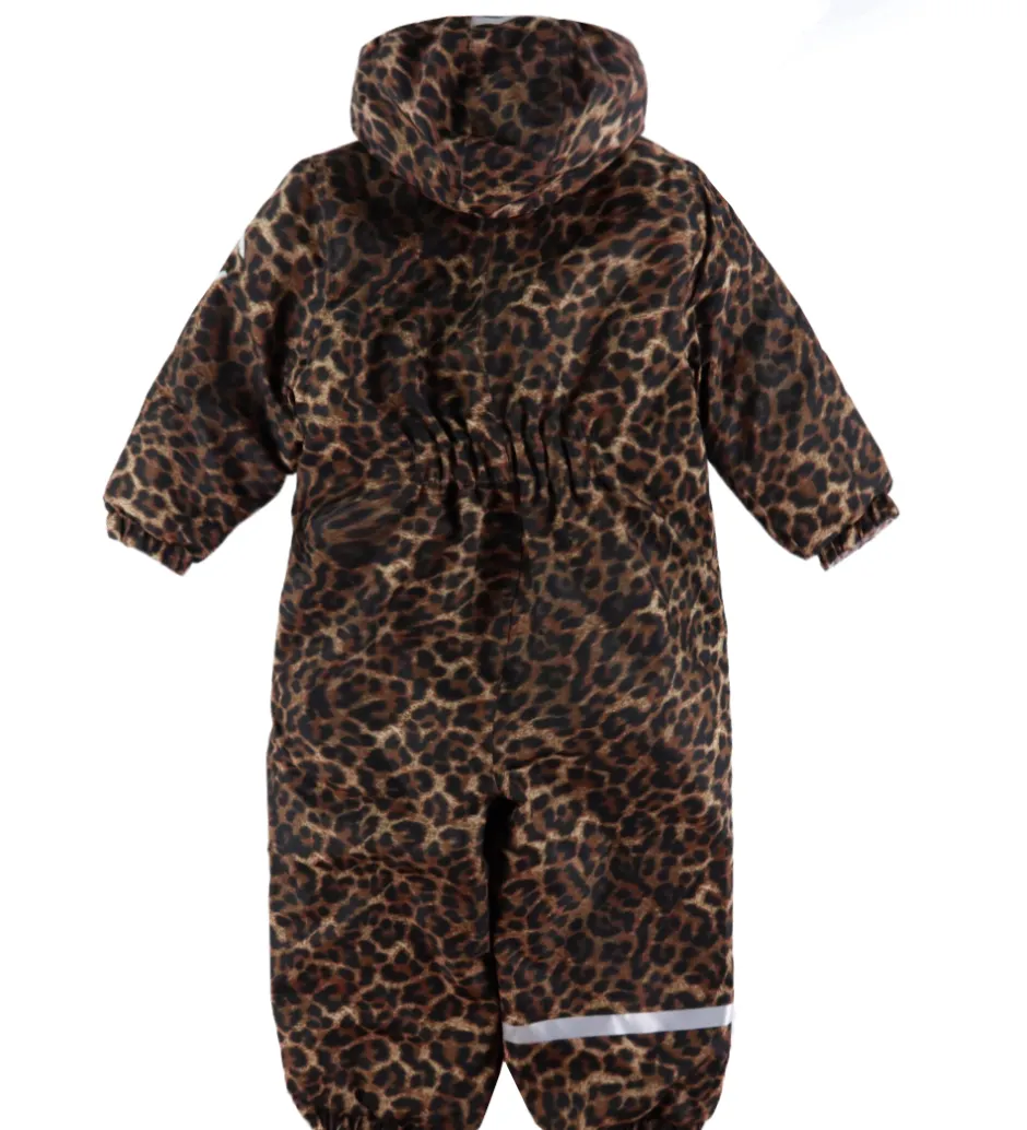Flot Mikk-Line flyverdragt med et leopardprint i brune og sorte nuancer. Flyverdragten har refleksdetaljer på hætten, venstre ærme og højre ben.