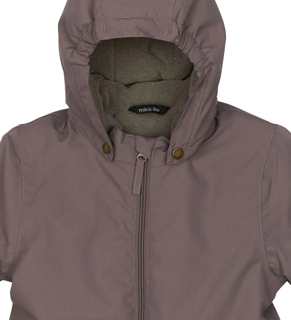 Skøn Mikk-Line flyverdragt i mørk, støvet lilla. Flyverdragten har refleksdetaljer på hætten, øverst på venstre ærme og rundt om højre ben. På højre ben står teksten “Recycled”.