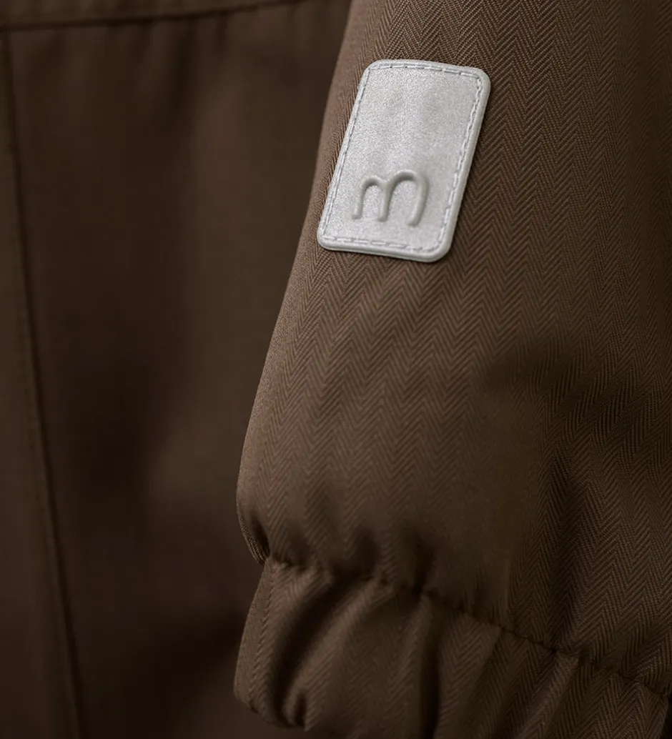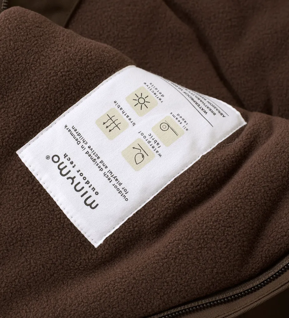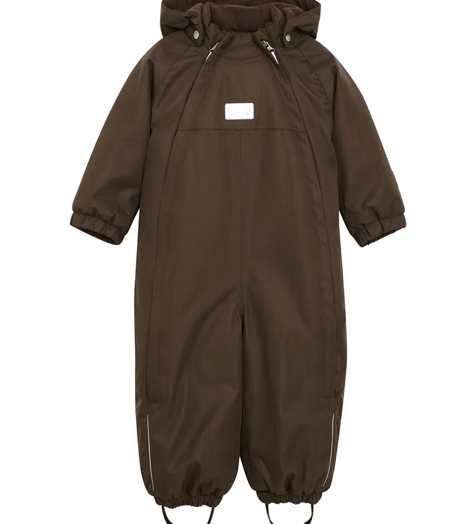 Dejlig Minymo flyverdragt i mørkebrun med flere velplacerede refleksapplikationer og -detaljer.