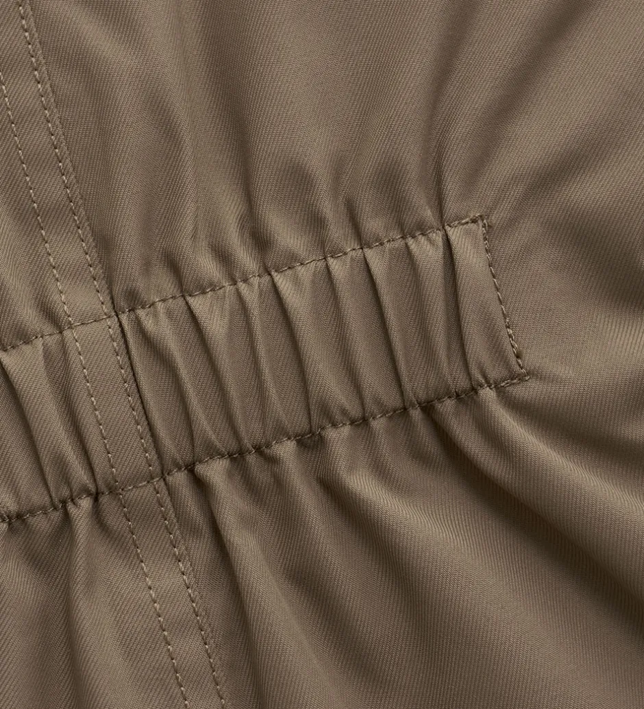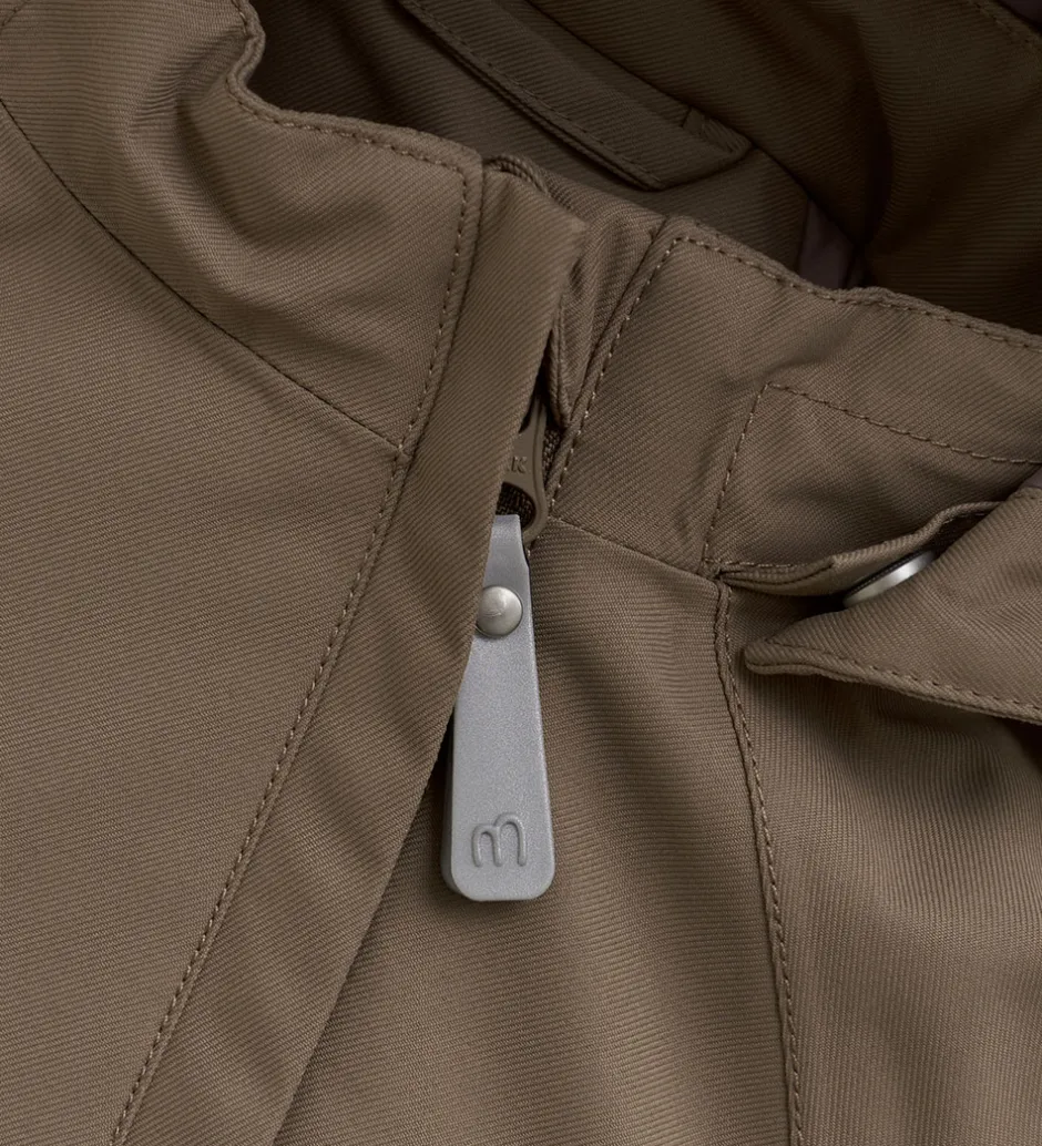 Dejlig Minymo flyverdragt i brun med flere velplacerede refleksprint og -detaljer.