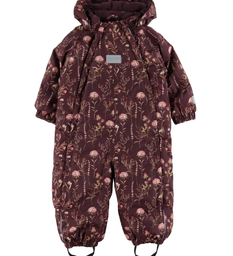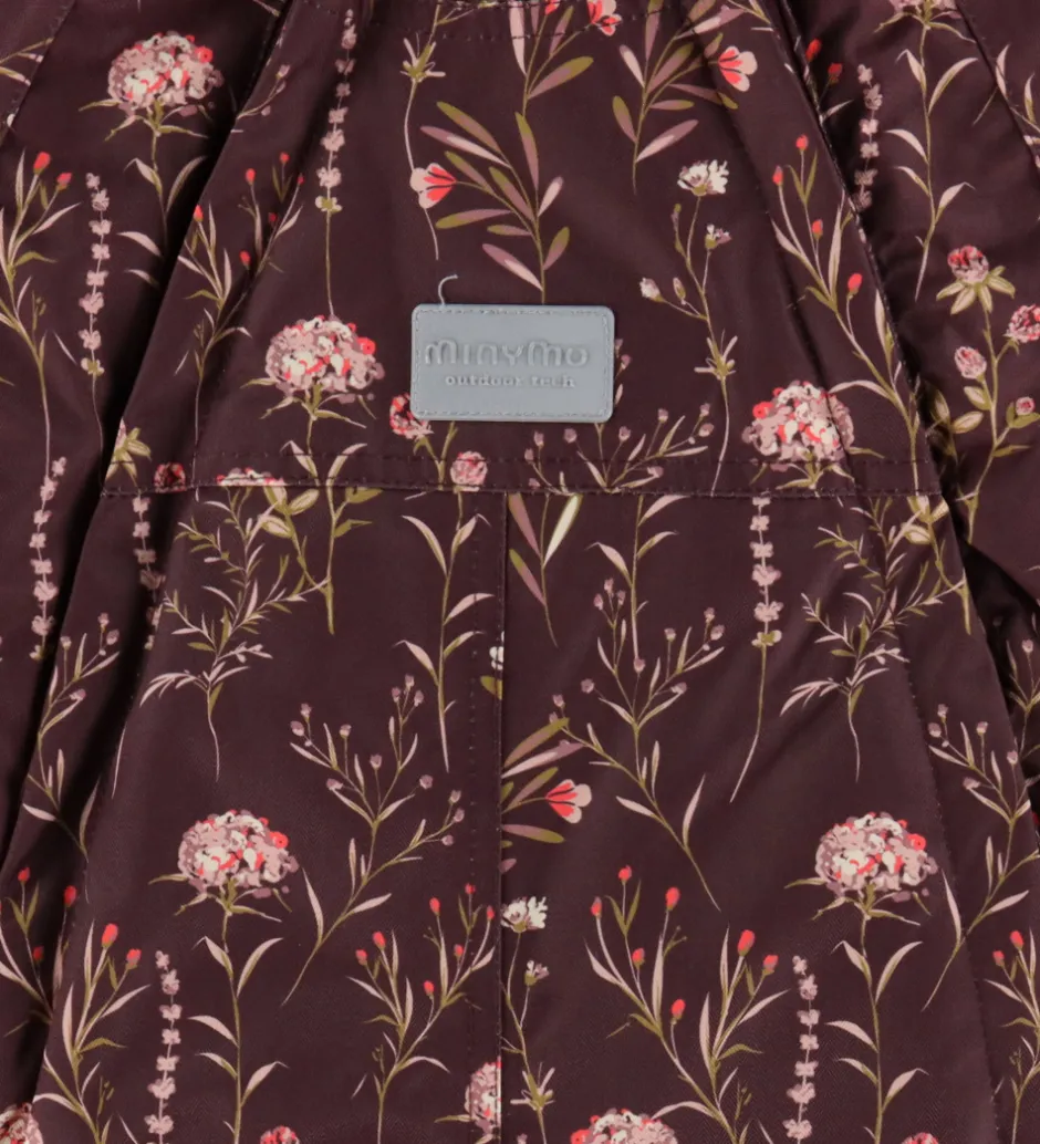 Dejlig Minymo flyverdragt i mørk lilla med et rosa alloverblomsterprint. Flyverdragten har flere velplacerede refleksapplikationer og -detaljer.