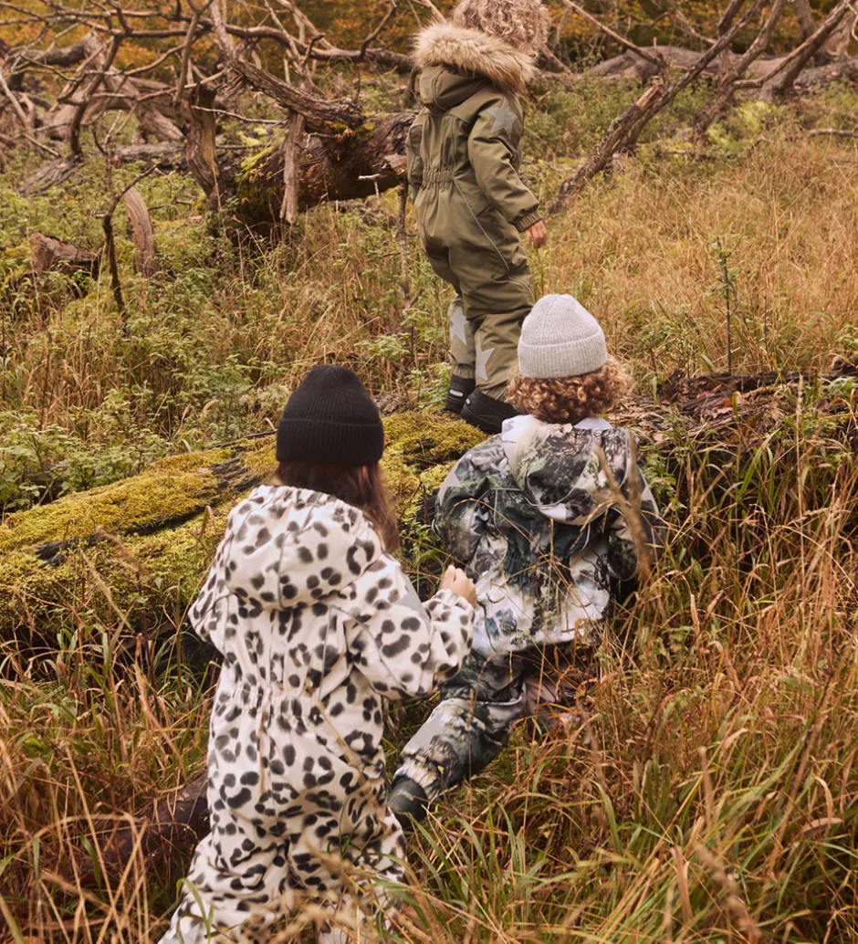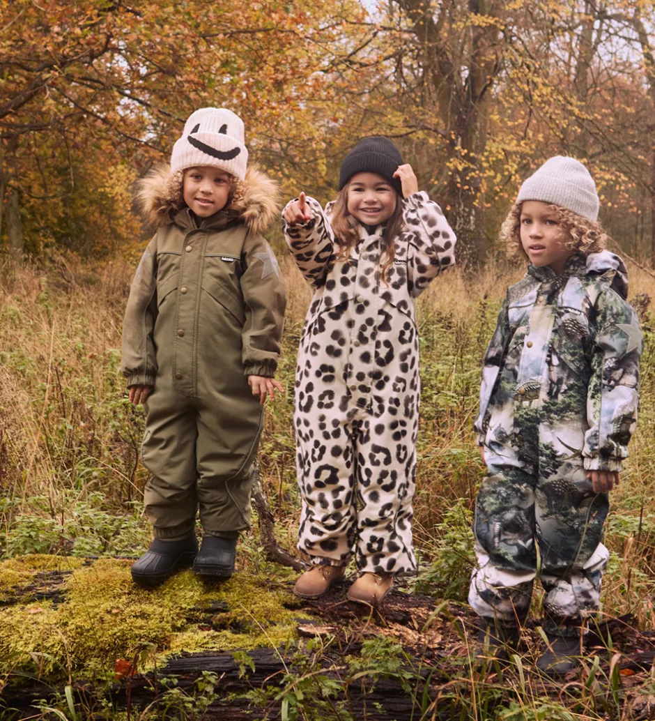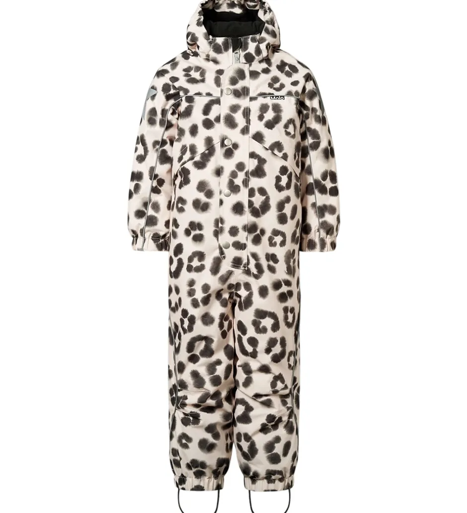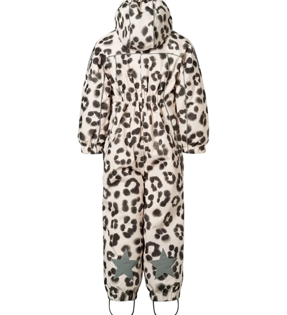 Smart Molo flyverdragt med et et lyst allover-sneleopardprint. Flyverdragten er udstyret med store stjernereflekser og reflekspipings.
