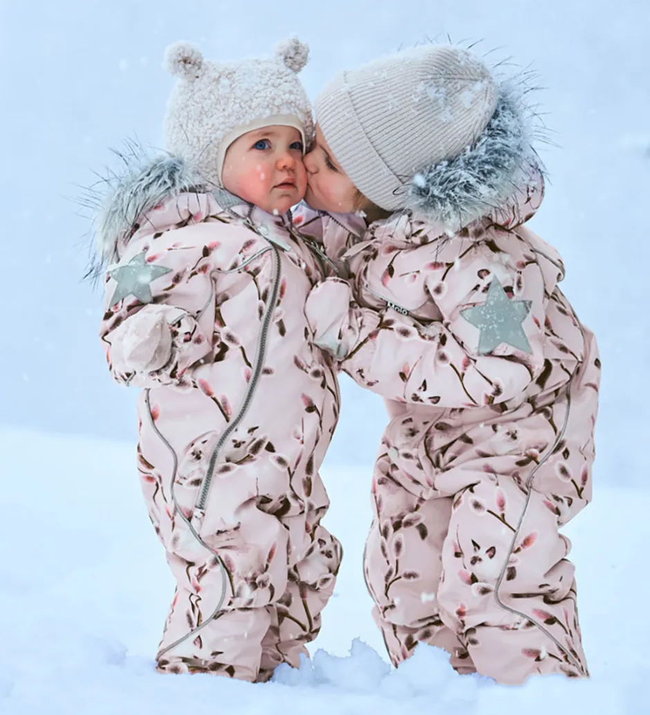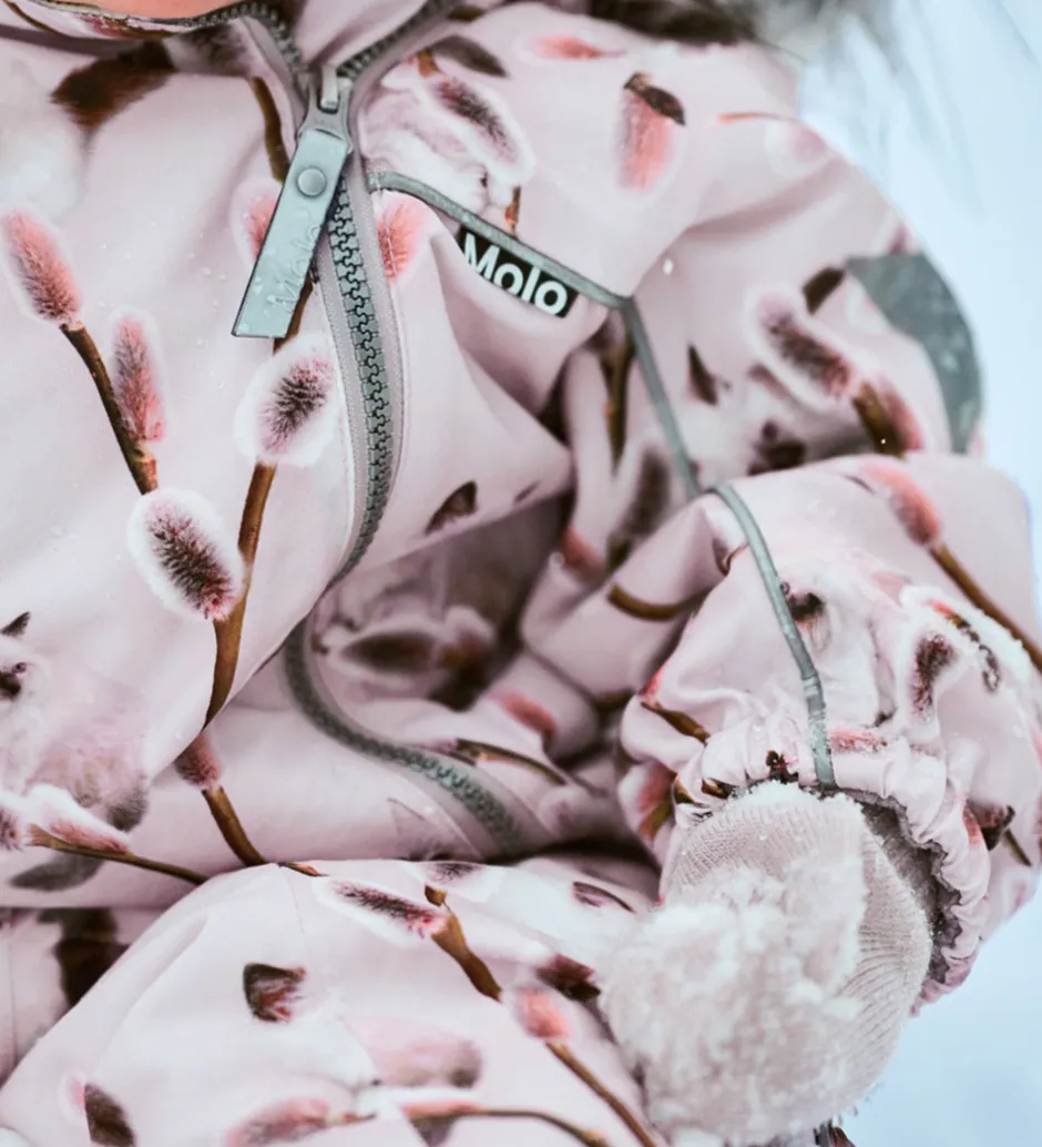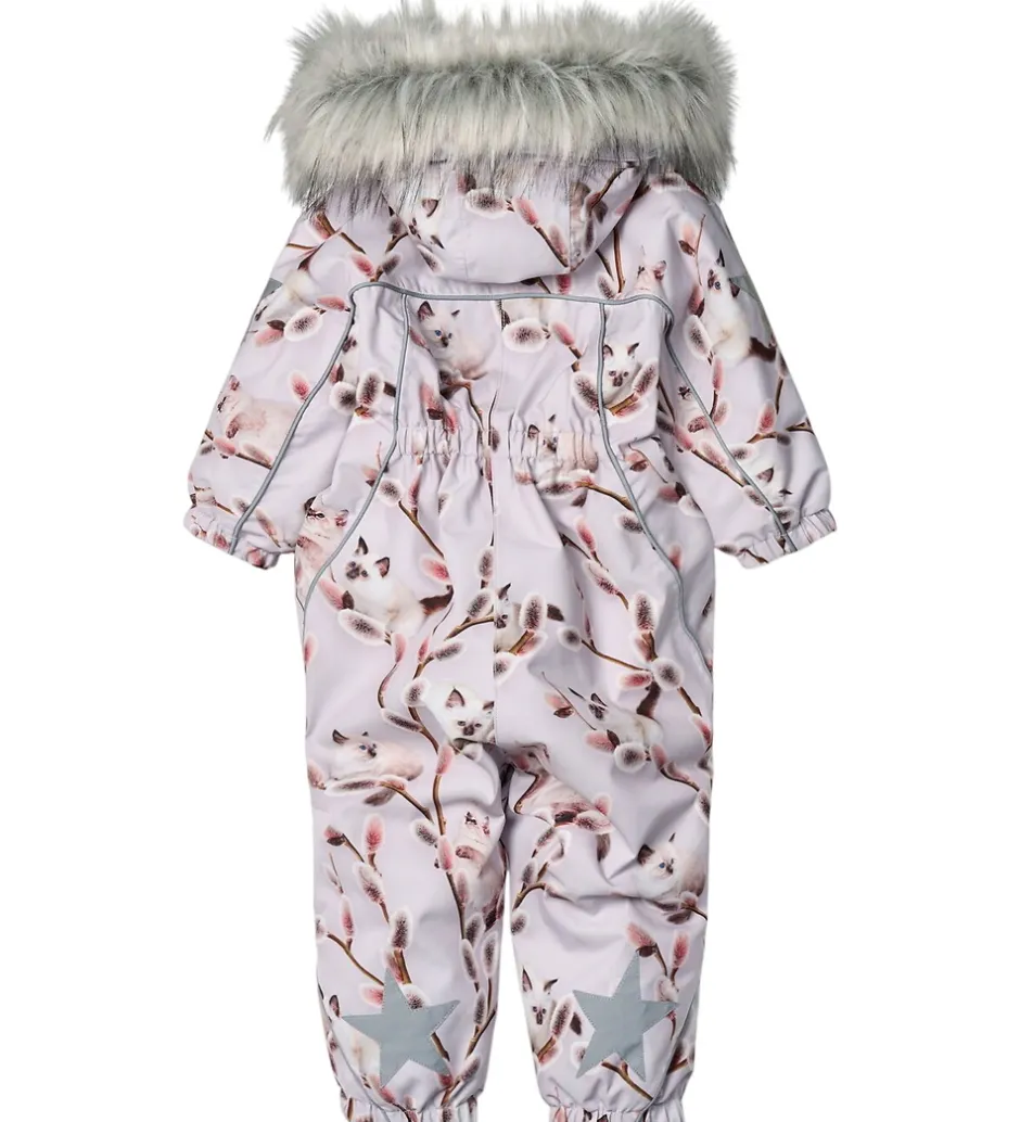 Flot Molo flyverdragt i et lyst rosa udtryk med et smukt alloverprint af piletræets gæslinger samt nuttede kattekillinger. Flyverdragten er udstyret med store stjernereflekser og reflekspipings.