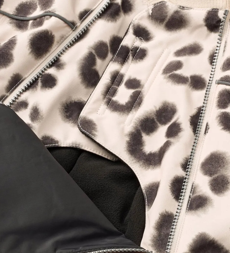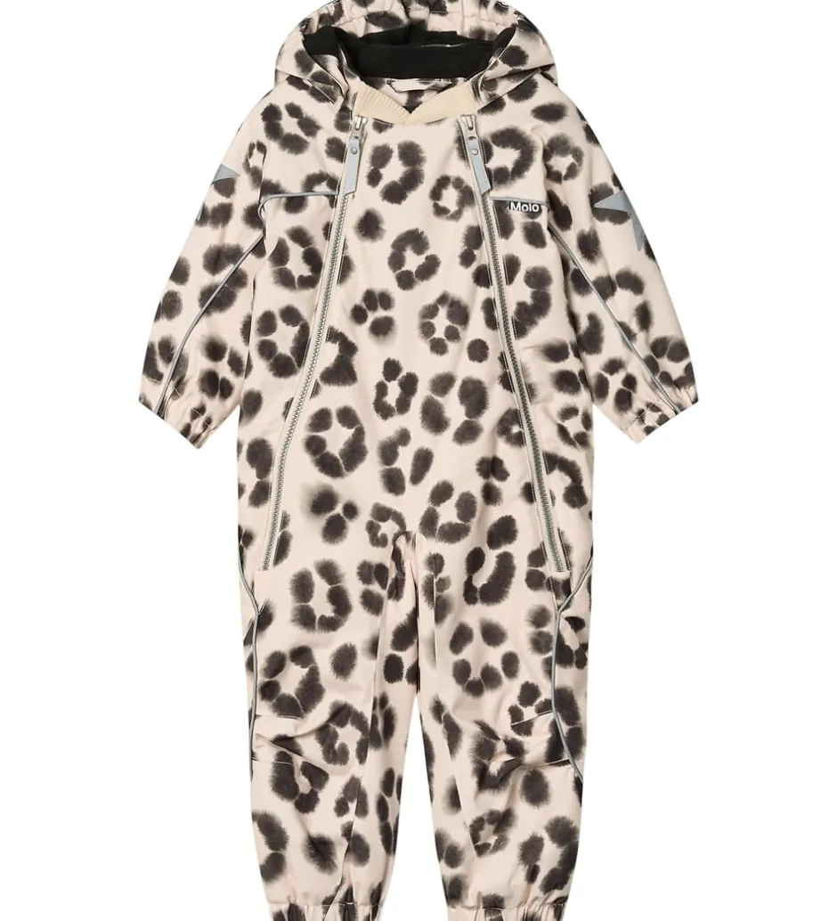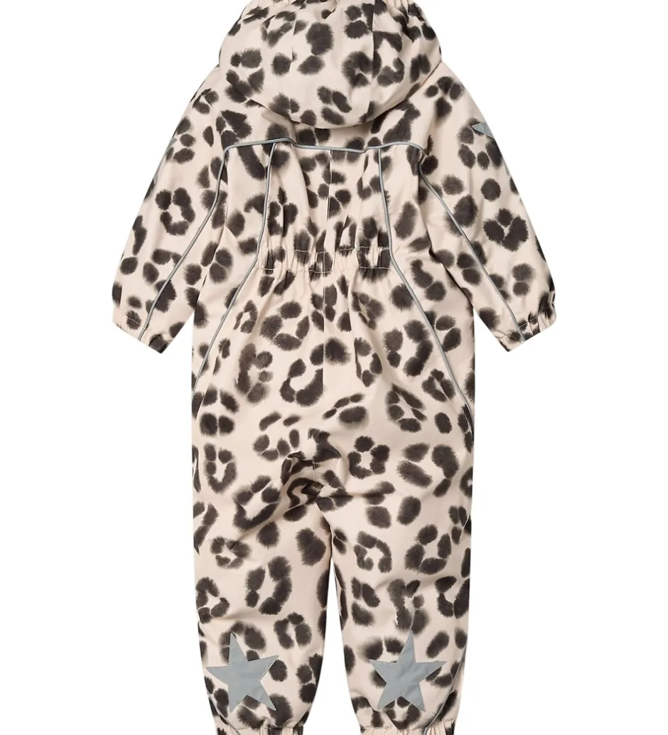 Flot Molo flyverdragt med et lyst allover-sneleopardprint. Flyverdragten er udstyret med store stjernereflekser og reflekspipings.