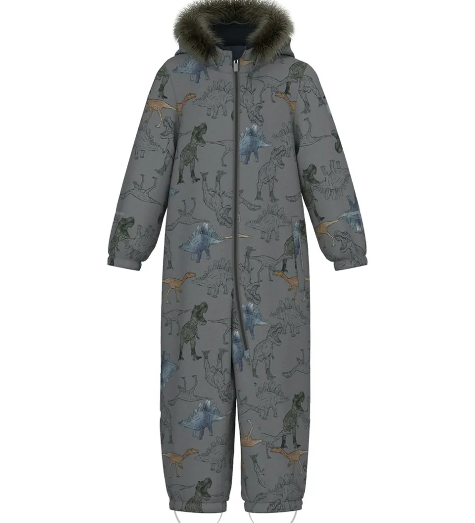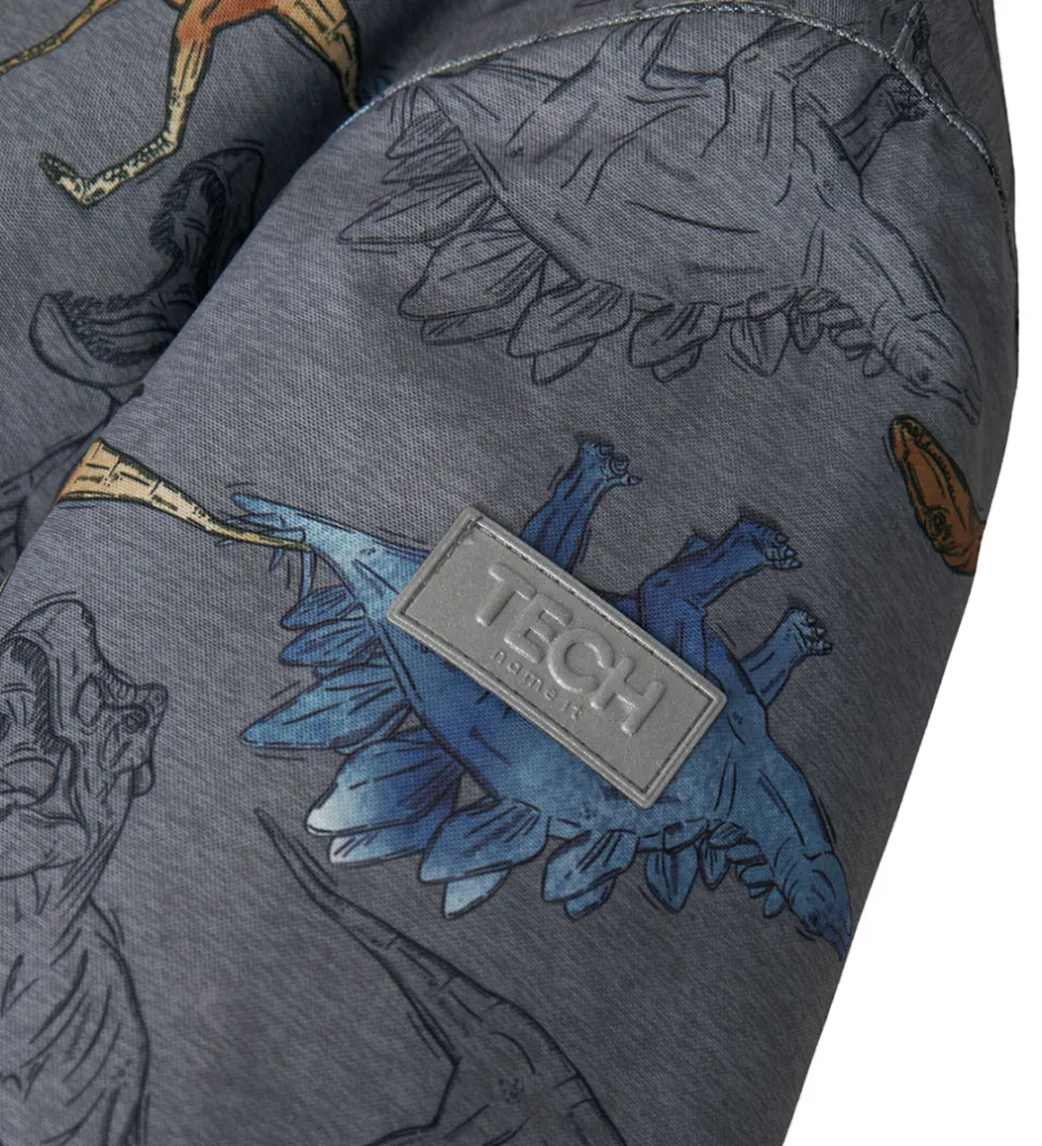 Fed Name It flyverdragt i grå med et alloverprint af dinosaurer i blå, grønne og orange nuancer.