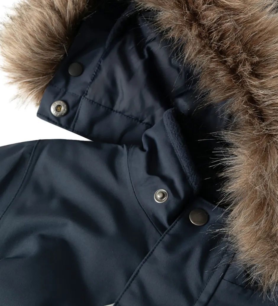 Name It flyverdragten har en aftagelig hætte, som sidder fast med skjulte trykknapper, og den har en flot kant af imiteret pels, som sidder fast med trykknapper. Hættens ansigtsåbning har en indvendig elastikkant af fleece. Ærmerne og benene har elastikkanter, og der er aftagelige, justerbare gummistropper til at sætte under støvlerne, så flyverdragten sidder hvor den skal.