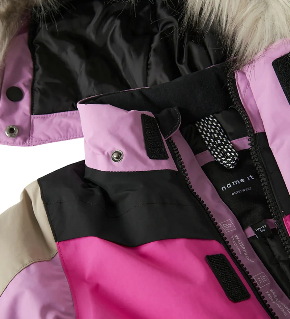 Name It flyverdragten har en aftagelig hætte, som sidder fast med skjulte trykknapper, og den har en flot kant af imiteret pels, som sidder fast med trykknapper. Hættens ansigtsåbning har en indvendig elastikkant af fleece. Ærmerne har elastikkanter med snefang og hul til tommelfingrene. I benåbningerne er der elastikkanter med velcro og trykknapper på ydersiden. Indvendigt i benåbningerne er der snefang og aftagelige, justerbare gummistropper, som kan sættes under fodtøjet.