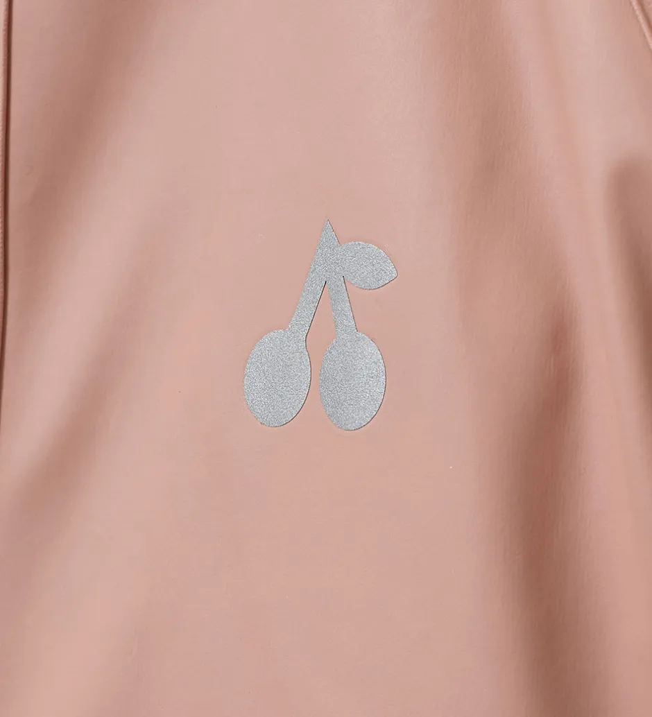 Skøn Sofie Schnoor flyverdragt af PU i rosa og med et refleksprint af kirsebær på brystet.