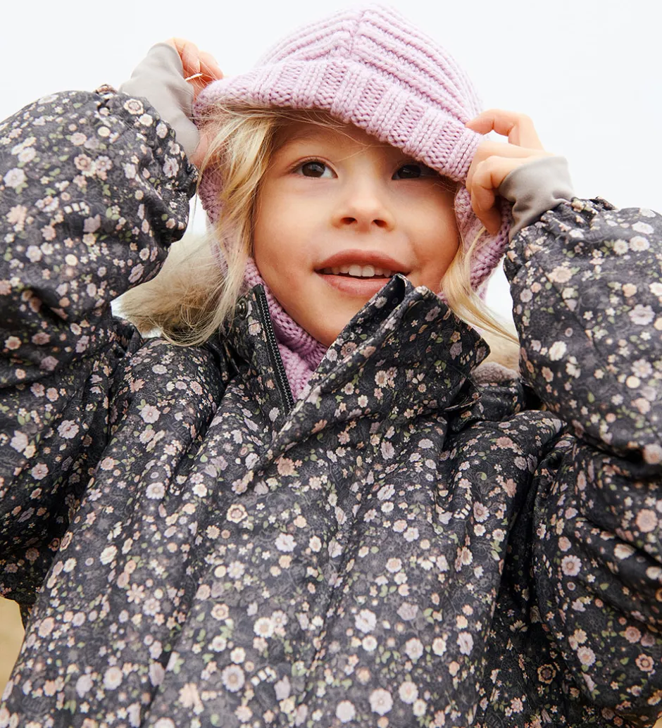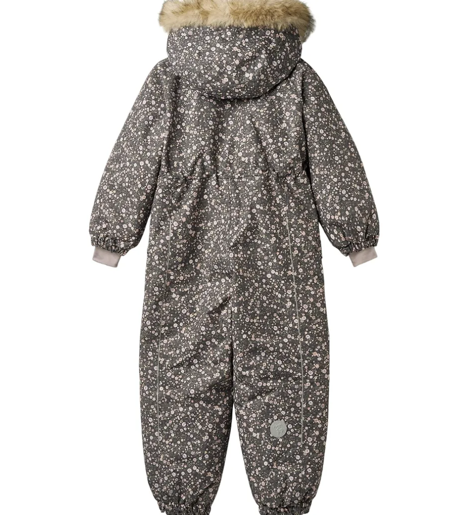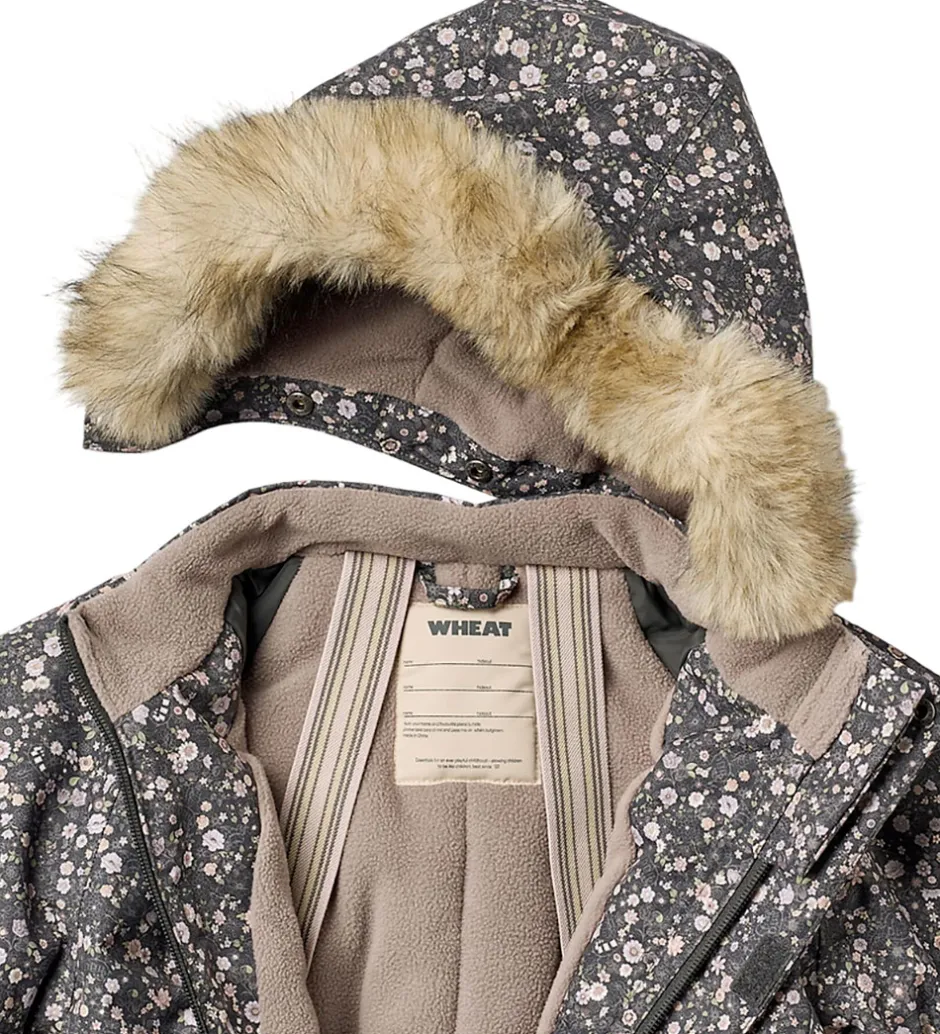 Pæn Wheat flyverdragt i mørk koksgrå med et alloverblomsterprint i støvede lilla, rosa og grønne nuancer og med en flot kant af imiteret pels på hætten. Flyverdragten rummer også både reflekspipings og -print.