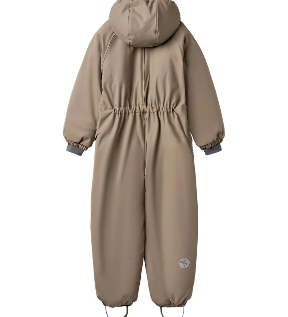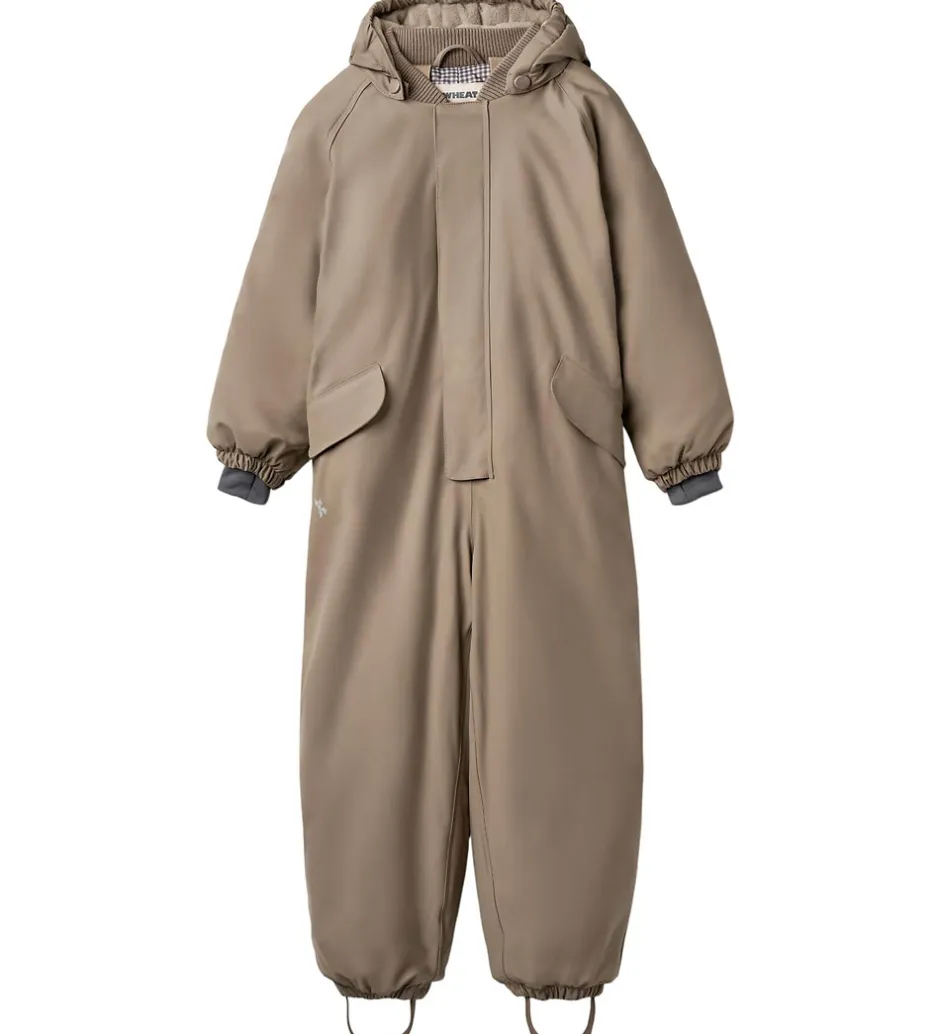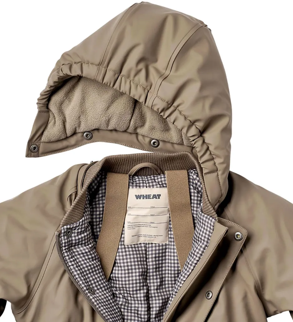 Wheat flyverdragten har lynlåsåbning med dobbelt vindstolpe, hvoraf den udvendige lukkes til med trykknapper. På fronten er der to tryknapslommer, og den har praktiske seler indvendigt. Flyverdragten har aftagelig hætte med trykknapper, og kan justeres med velcro på toppen. Der er ribkrave, som er behagelig for barnet at have tæt på huden.