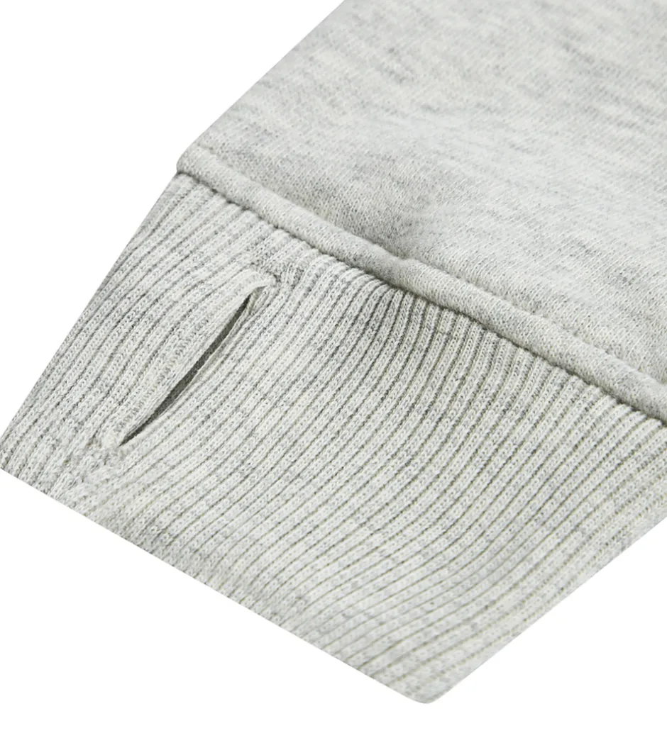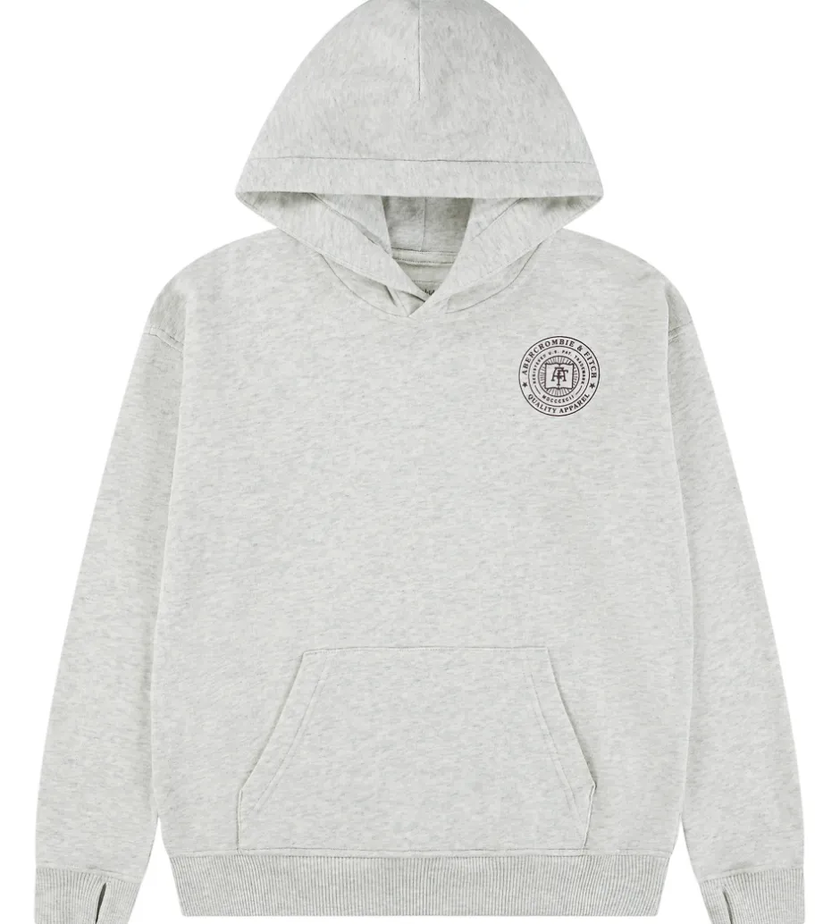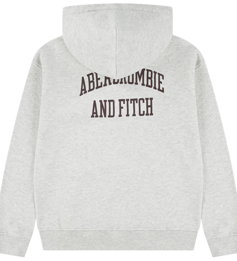 Elegant hættetrøje fra Abercrombie & Fitch i lysegråmeleret sweat, og på ryggen er der et stort print i bordeaux. Hættetrøjen har en fast hætte med et bomuldsfor, og den har brede ribkanter. Ved ærmerne er der et lille hul til tommelfingeren. Fortil sidder der en stor kængurulomme, og hættetrøjen har blødt, børstet bomuld på indersiden.