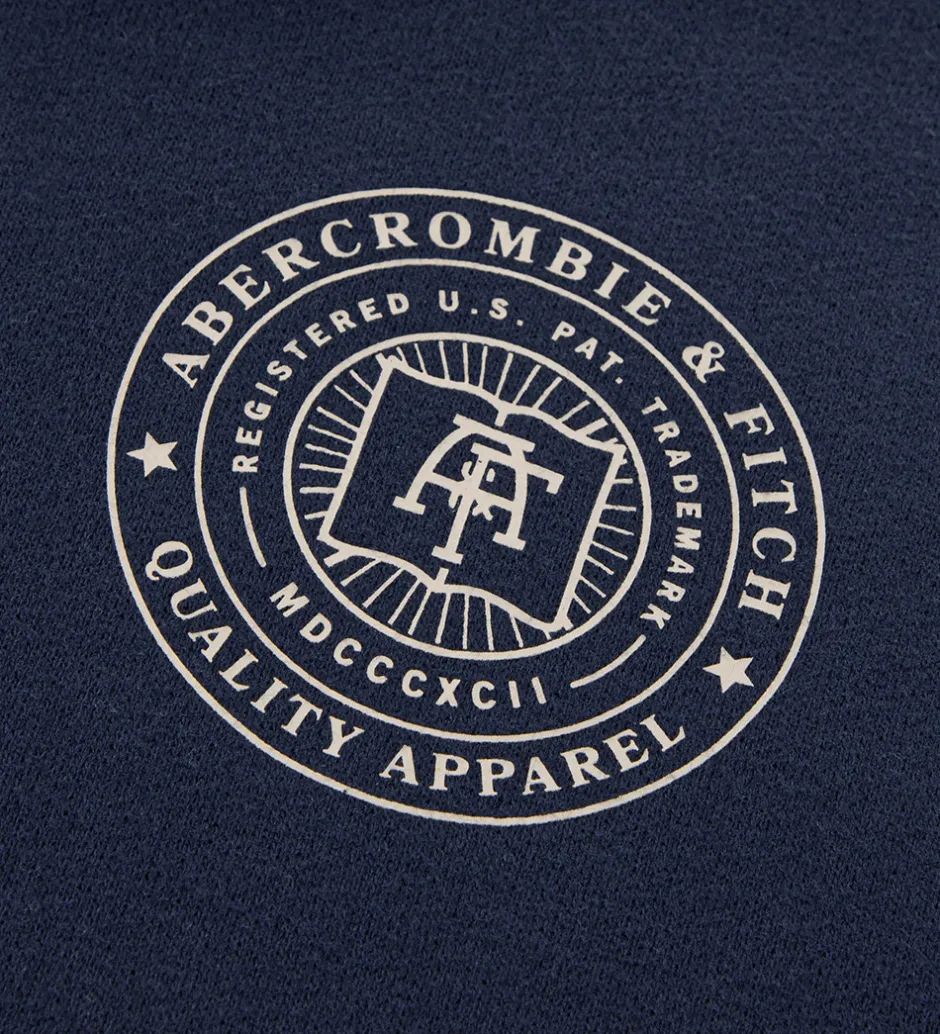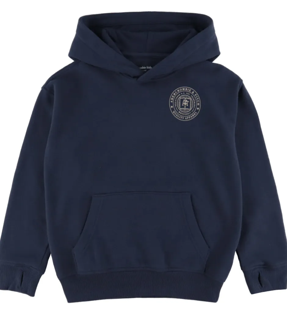 Lækker hættetrøje fra Abercrombie & Fitch i navy sweat, og på ryggen er der et stort print i beige. Hættetrøjen har en fast hætte med et bomuldsfor, og den har brede ribkanter. Ved ærmerne er der et lille hul til tommelfingeren. Fortil sidder der en stor kængurulomme, og hættetrøjen har blødt, børstet bomuld på indersiden.