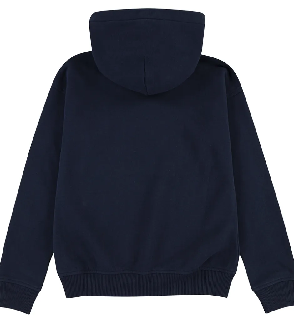Flot hættetrøje fra Abercrombie & Fitch i ensfarvet navy sweat. Hættetrøjen har en fast hætte med et bomuldsfor, og den har brede ribkanter. Ved ærmerne er der et lille hul til tommelfingeren. Fortil sidder der en stor kængurulomme, og hættetrøjen har blødt, børstet bomuld på indersiden.