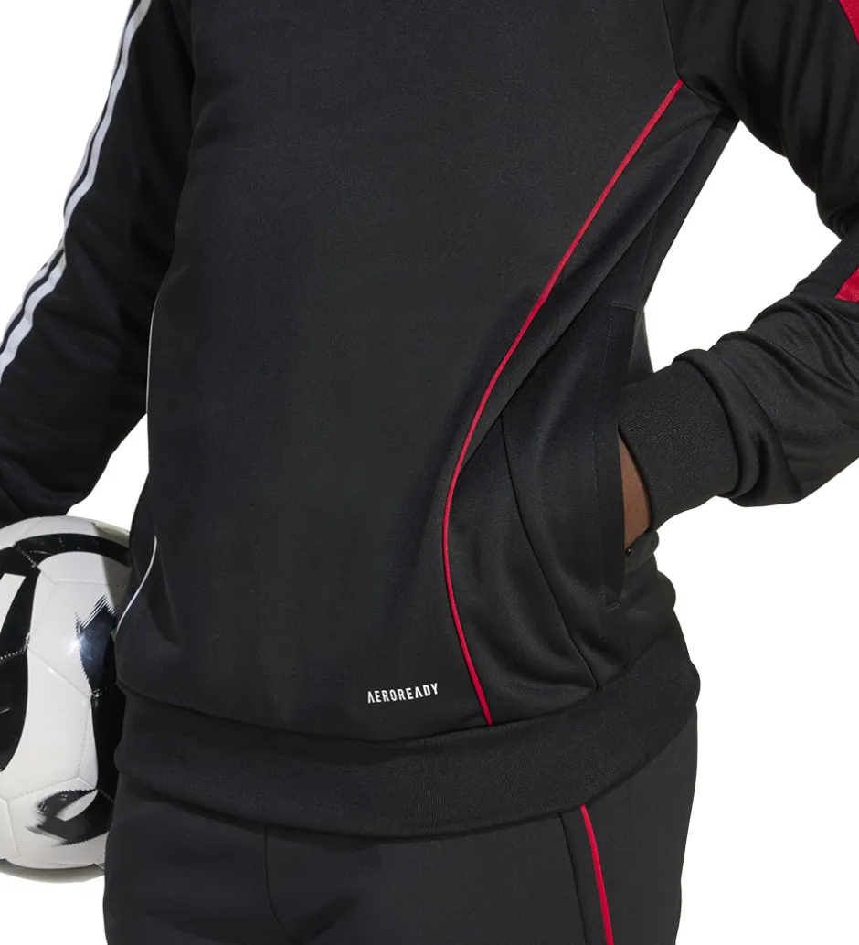 Stilfuld adidas Performance hættetrøje i klassisk sort med kontraststriber i hvid på den ene ærme og røde på det andet. Hættetrøjen har fodboldklubben Ajax´ logo, samt adidas logoet på brystet. Forsynet med en praktisk lynlås fra halsen og ned. Nederste kant og ærmer afsluttes med ribkanter for en tætsiddende pasform.