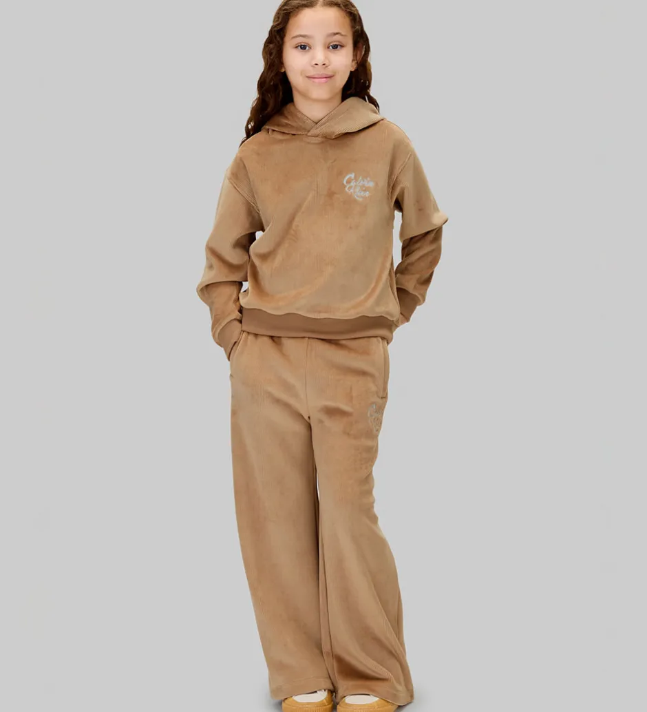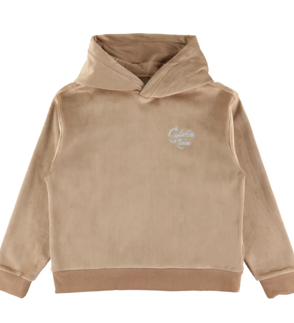 Elegant Calvin Klein sæt i beige fløjl med et broderet logo. Sættet består af en hættetrøje og et par fløjlsbukser. Hættetrøjen har ribkant ved ærmerne og forneden, og et hættefor i blød bomuld. Calvin Klein fløjlsbukserne har en elastikkant med justerbare bindesørre.