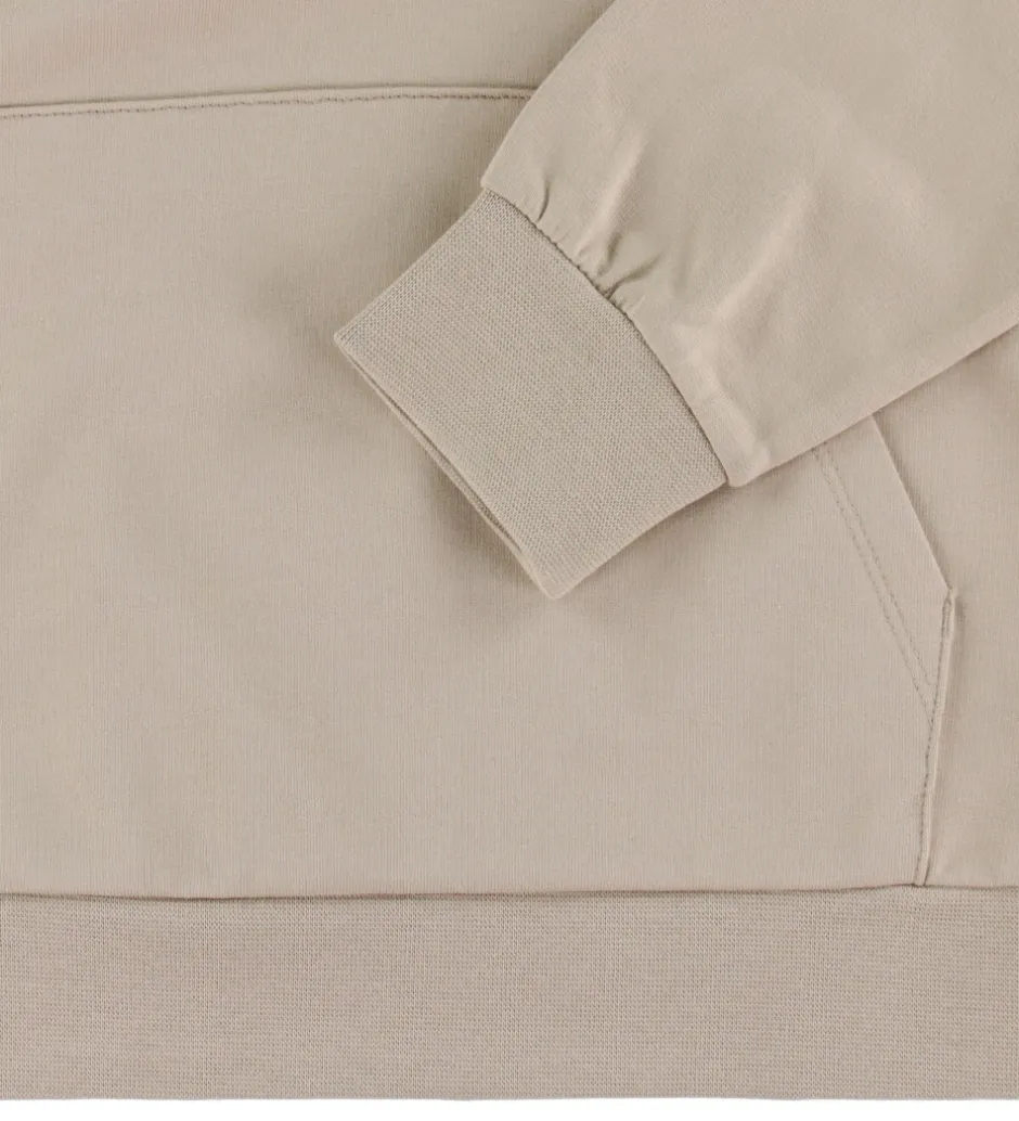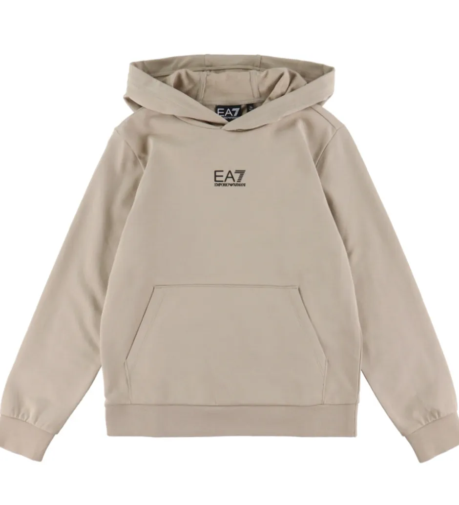 Lækker EA7 hættetrøje i beigefarvet sweat, og fortil er der trykt et lille, sort logo.