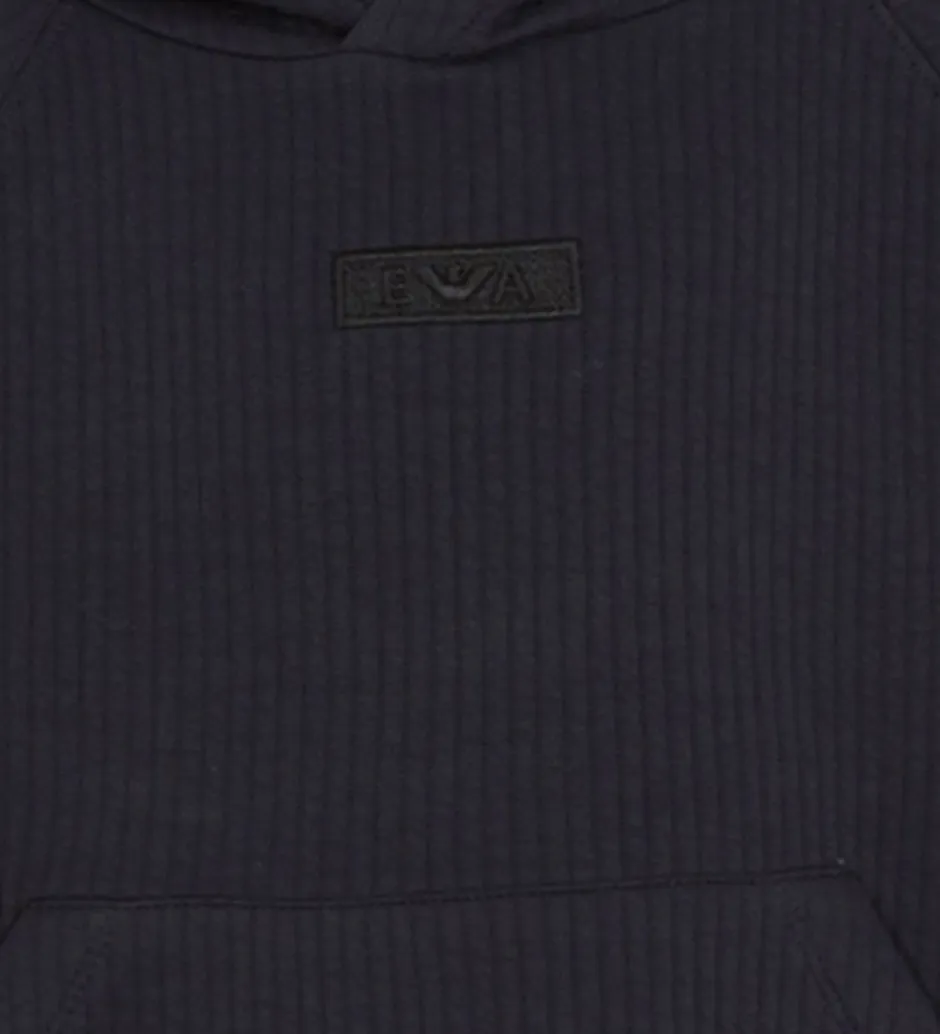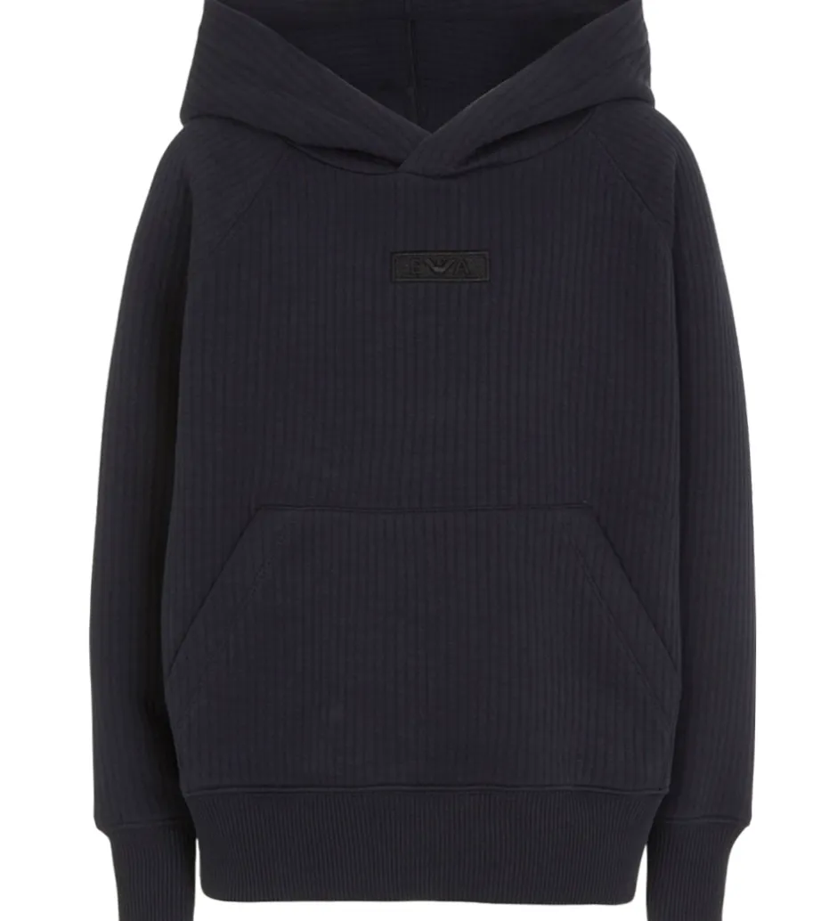 Flot Emporio Armani hættetrøje i navy med en diskret quiltet struktur, der giver lodrette linker. Hættetrøjen har et stilfuldt, broderet logo på brystet. Emporio Armanis hættetrøje har en klassisk, rummelig kængurulomme og bløde ribkanter ved livet og ærmerne, der sikrer en god pasform. Hættetrøjen er lavet i en blød bomuldsjersery.