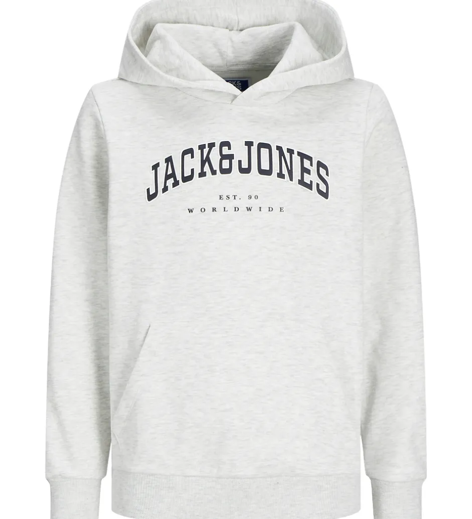 Elegant hættetrøje fra Jack & Jones i en meleret lysegrå med et stort logoprint på brystet af teksten “Jack & Jones EST. 90 Worldwide”.
