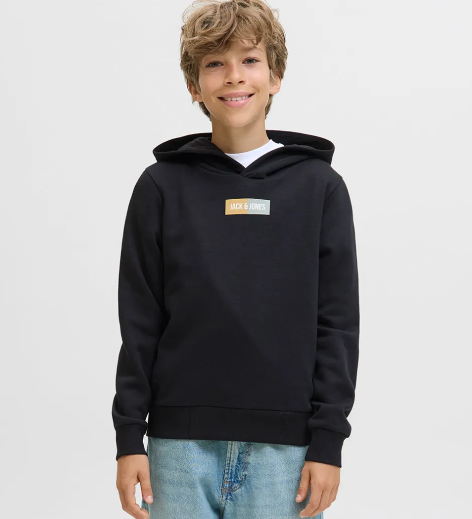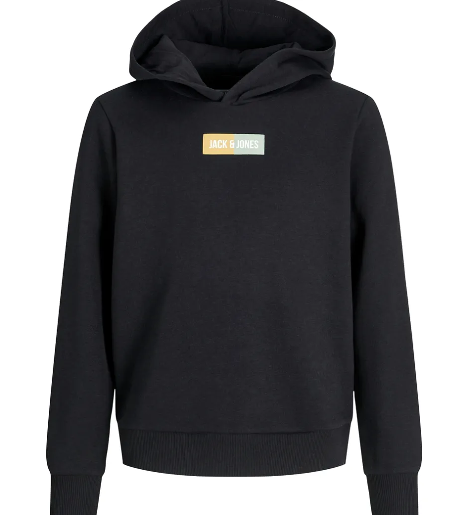 Elegant hættetrøje fra Jack & Jones i klassisk sort med et diskret logoprint på brystet. Jack & Jones hættetrøjen er designet med ribkanter ved håndled og liv, der giver en flot pasform.