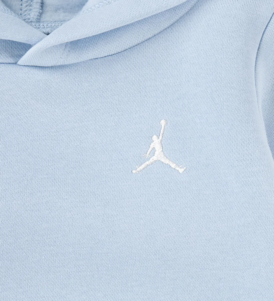 Blødt Jordan sweatsæt, der består af en hættetrøje og et par sweatpants. Begge dele er i lyseblå med et hvidt broderet logo i venstre side.