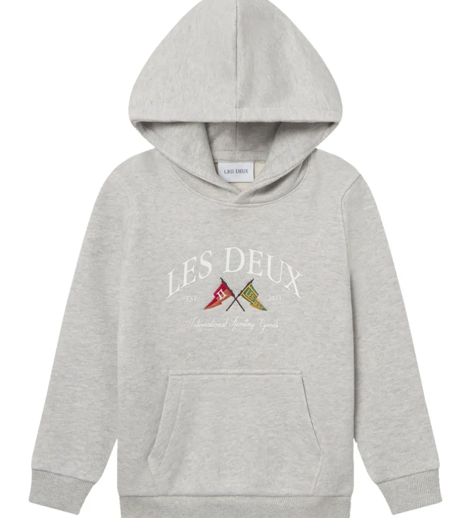 Dejlig Les Deux hættetrøje i en lys gråmeleret med et flot logoprint og broederet flagmotiv på fronten.