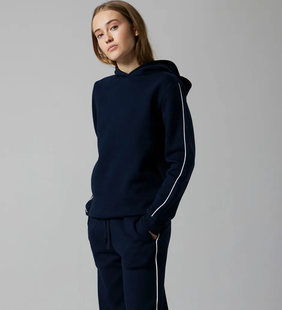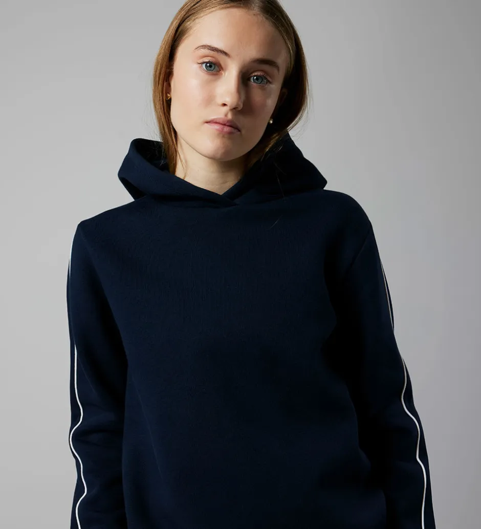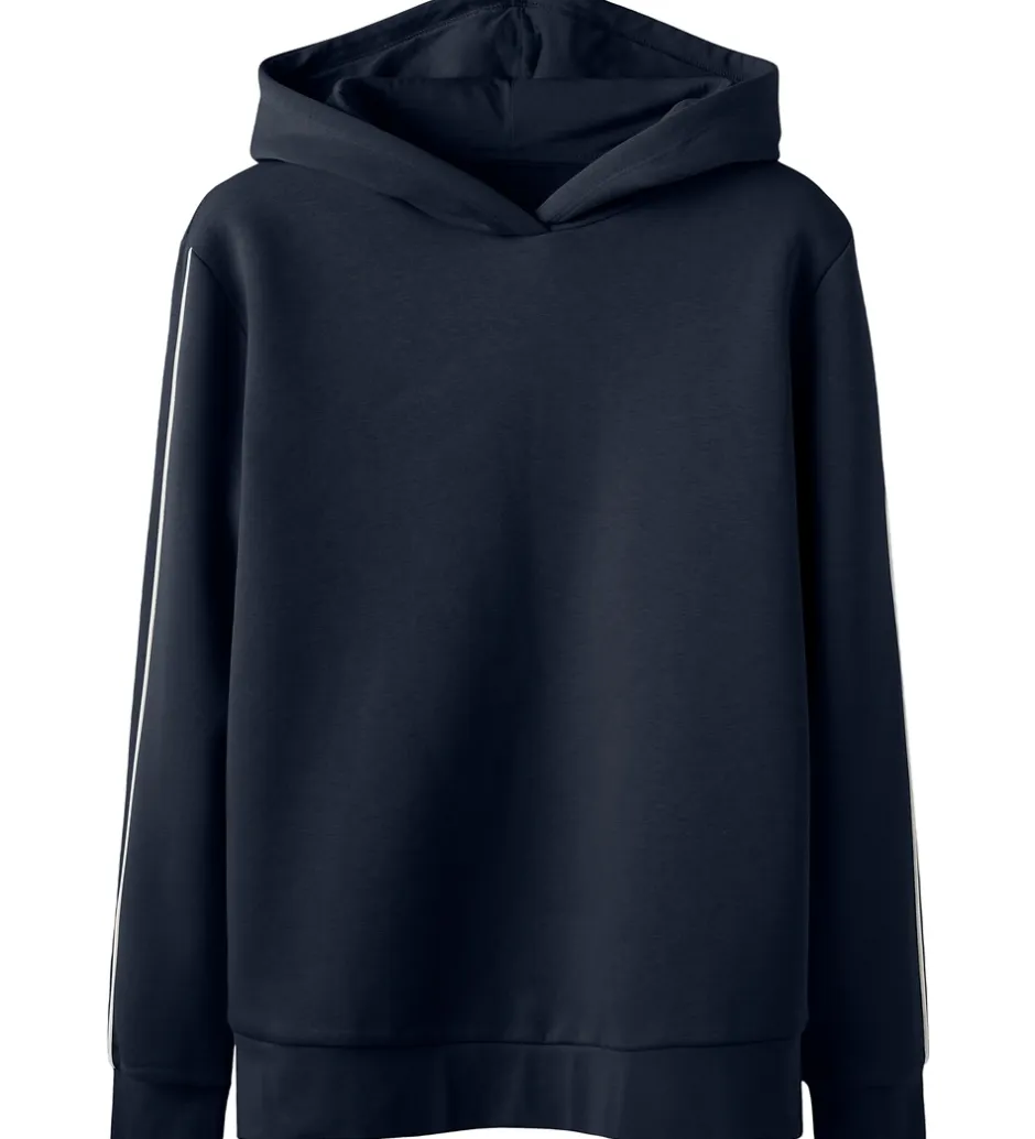 Stilren LMTD hættetrøje i en dyb, mørkeblå farve. LMTD hættetrøje har en klassisk hætte og er designet med ribkanter ved håndleddene og livet. Langs ærmerne ses diskrete, lyse striber, der giver et moderne udtryk.