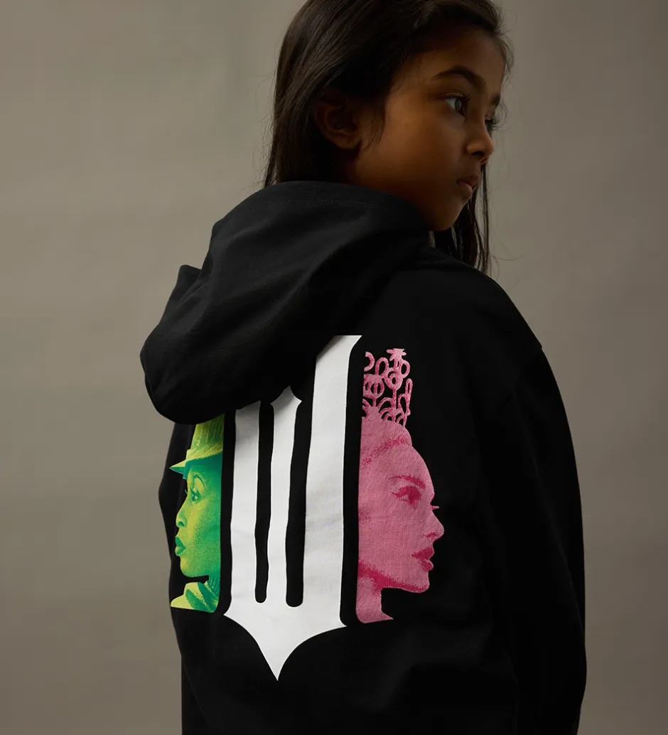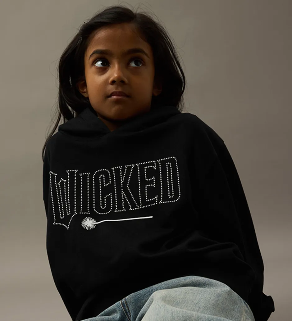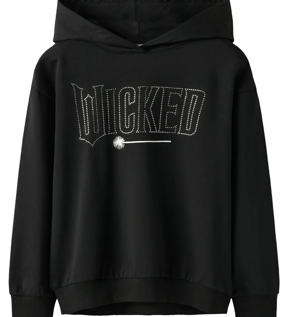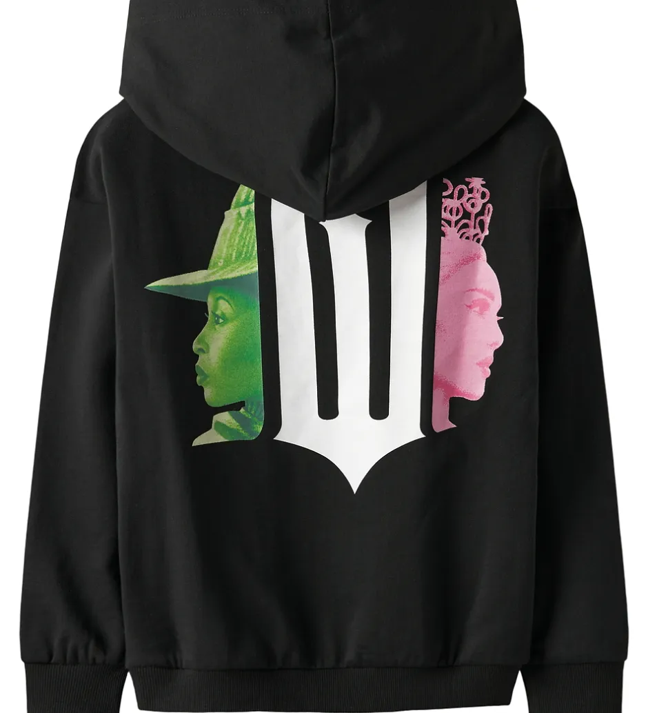 Smart Name It hættetrøje i sort med små similisten på fronten som danner filmtitlen “Wicked” og et print af en tryllestav. På ryggen er der et stort print af et “W” og to karakterer fra filmen i grøn og pink. Name It hættetrøjen har en rummelig hætte og brede ribkanter ved ærmerne og i livet. Indvendigt er der blødt, børstet bomuld.