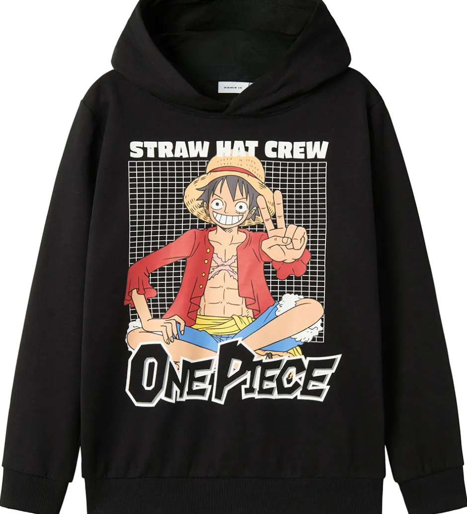 Smart Name It hættetrøje i sort med et stort og farverigt print på fronten af en karakter fra mangaserien One Piece. Hættetrøjen har en fastsyet, blød hætte og lange ærmer med brede ribkanter i ærme- og taljeåbning.