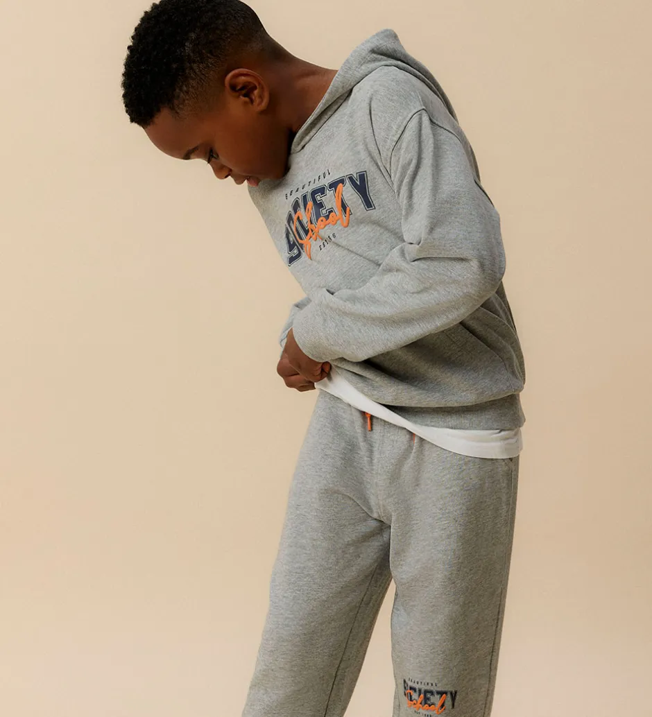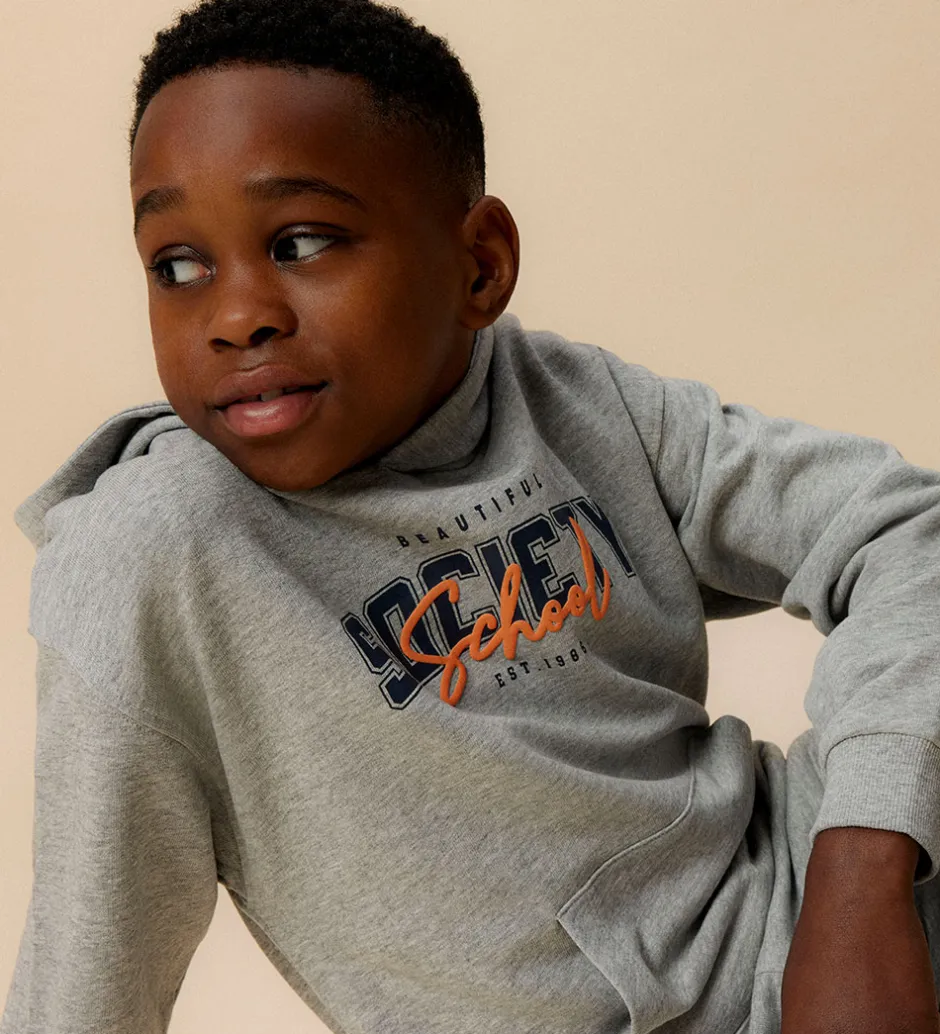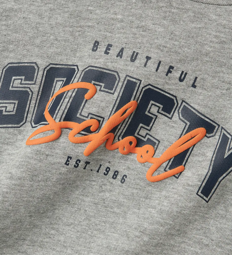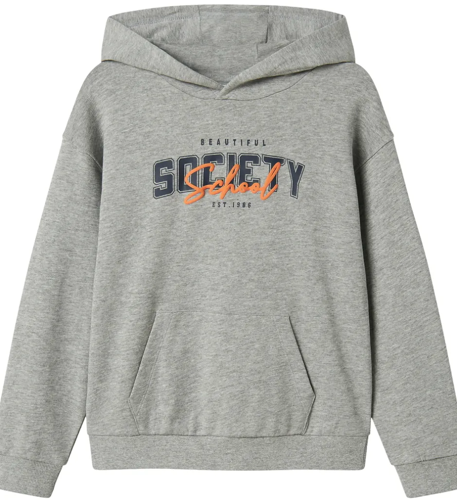 Stilren hættetrøje fra Name It i en neutral grå nuance. Hættetrøjen prydes af et iøjefaldende print på brystet med teksten “Society School” i en kombination af navy og orange. Name It hættetrøjen har en praktisk kængurulomme på fronten samt ribkanter ved håndleddene og i livet. Indvendigt har hættetrøjen blødt børstet bomuld.
