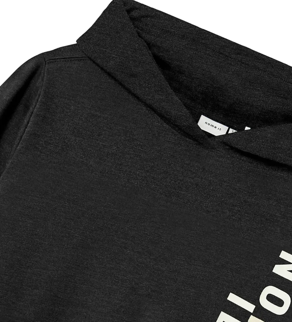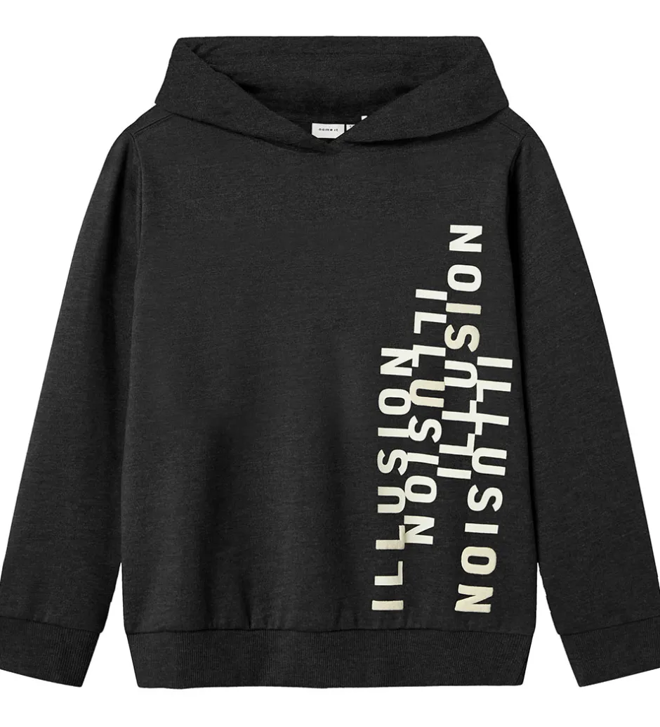 Moderne hættetrøje fra Name It i meleret koksgrå med et vertikalt print i venstre side med teksten “Illusion” i hvid. Hættetrøjen har en blød hætte og lange ærmer med ribkanter i ærme- og taljeåbning. Indvendigt er der blødt, børstet bomuld.