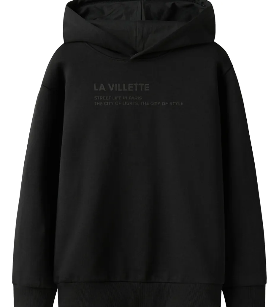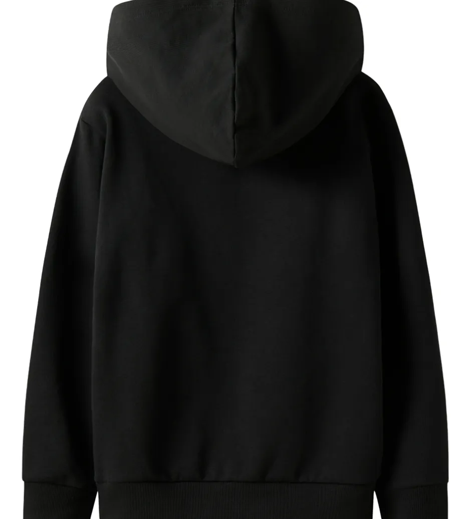 Smart Name It hættetrøje i sort med et diskret tekstprint på brystet i sort. Hættetrøjen har en fastsyet, blød hætte og lange ærmer. Den har brede ribkanter i ærme- og taljeåbning, og indvendigt er der blødt, børstet bomuld.
