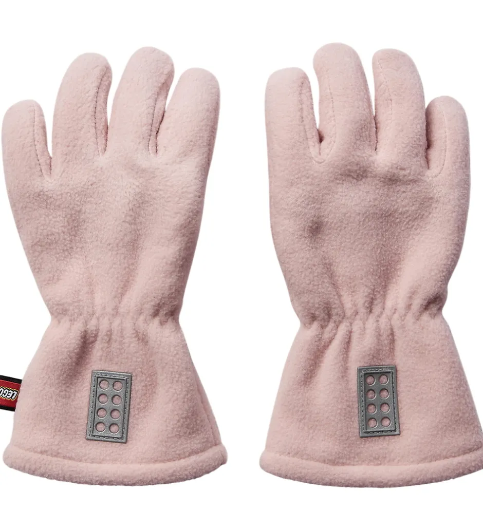 Lækre LEGO® Wear handsker i rosa fleece. På oversiden af håndleddene er der påsyet en refleks, som ligner en LEGO® klods.
