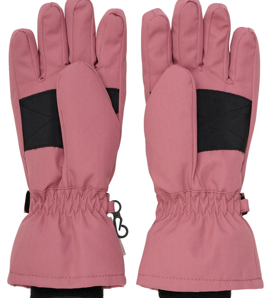 Lækre Minymo handsker i en varm rosa nuance. Handskerne har brede ribkanter i åbningerne, og de kan strammes ind ved håndleddene med velcroremme. Indvendigt er der blødt fleecefor. Handskerne er vandtætte, åbndbare og slidstærke.