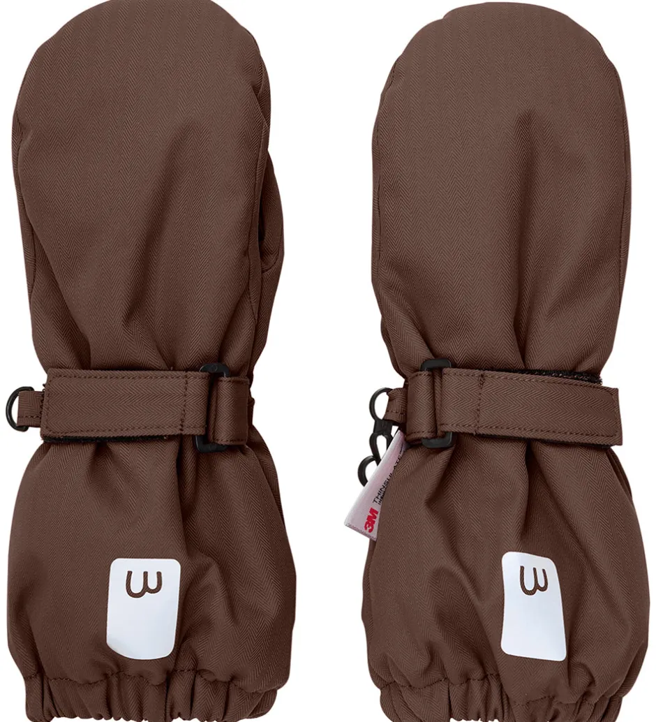 Lækre Minymo luffer i mørkebrun med et lille reflekslogo øverst. Minymo lufferne har elastik i åbningen, og kan strammes med en velcrorem omkring håndleddet. Lufferne har blødt fleecefor indvendigt.
