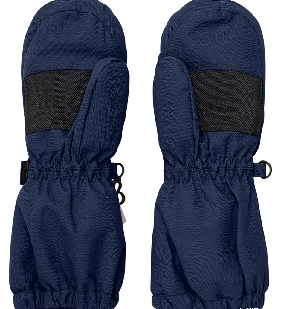 Skønne Minymo luffer i navyblå med et lille reflekslogo øverst. Minymo lufferne har elastik i åbningen, og kan strammes med en velcrorem omkring håndleddet. Lufferne har blødt fleecefor indvendigt.
