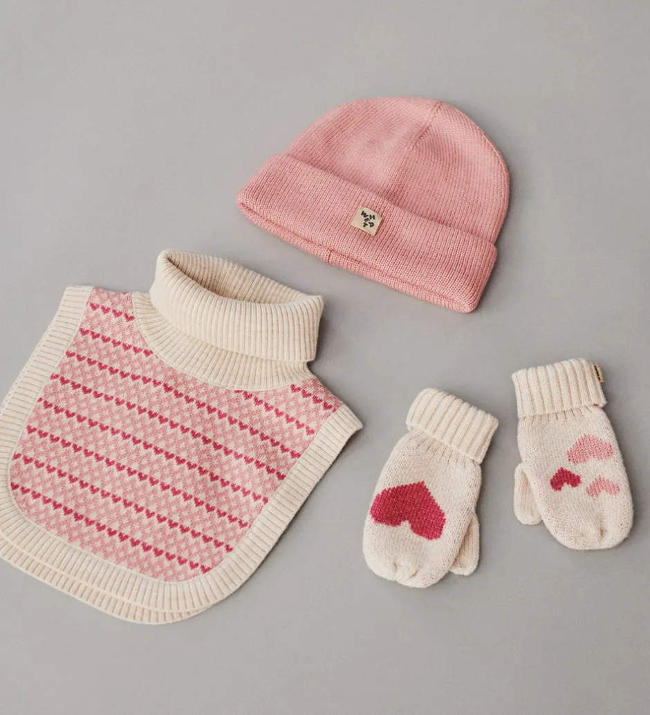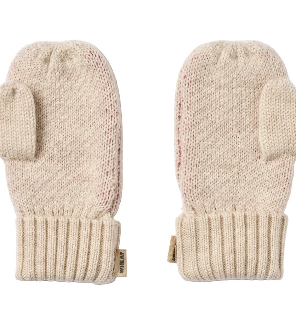 Skønne Wheat luffer strikket med en jacquardstruktur, hvor lufferne har hvert sit design. Den ene er beige med et hjerte, mens den anden har tre mindre hjerter i rosa nuancer.